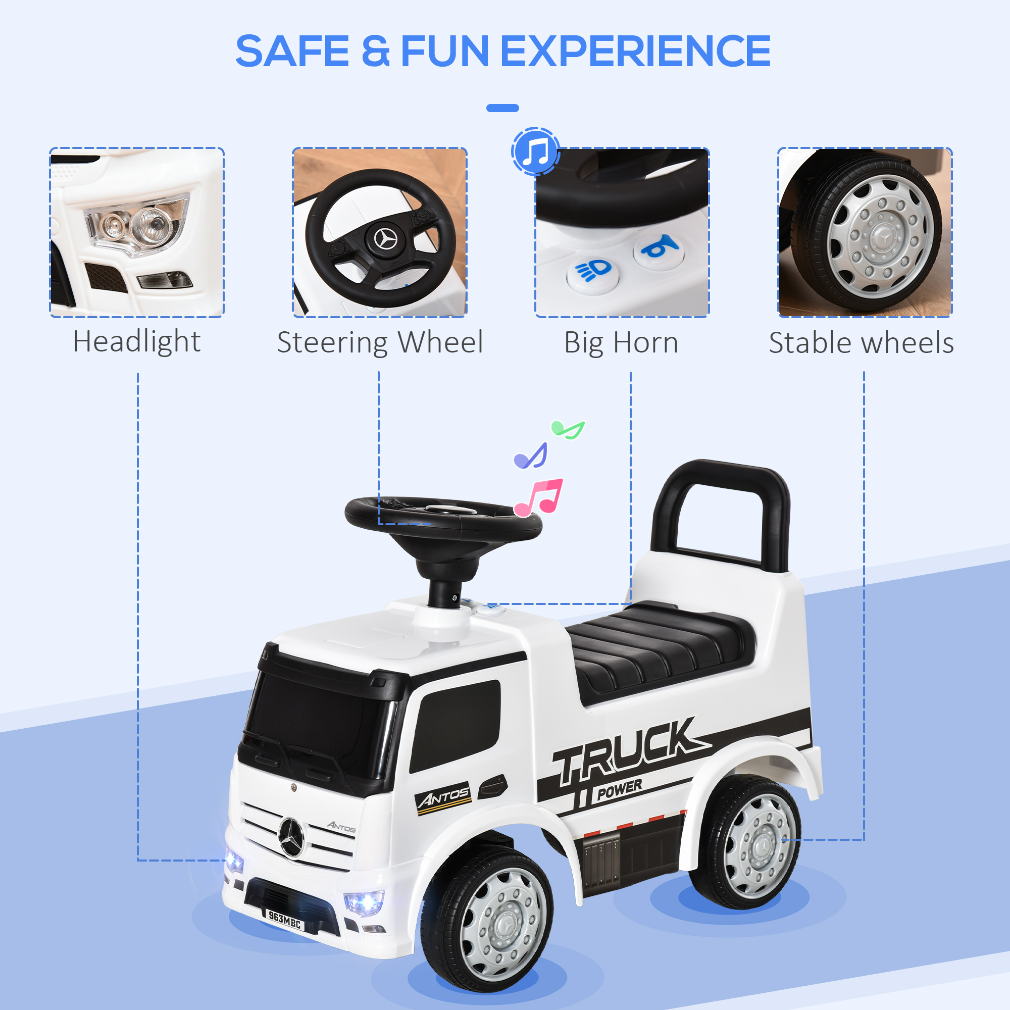 - Moving steering wheel, a horn with sound effects and 2 headlights gives it a realistic and fun feel