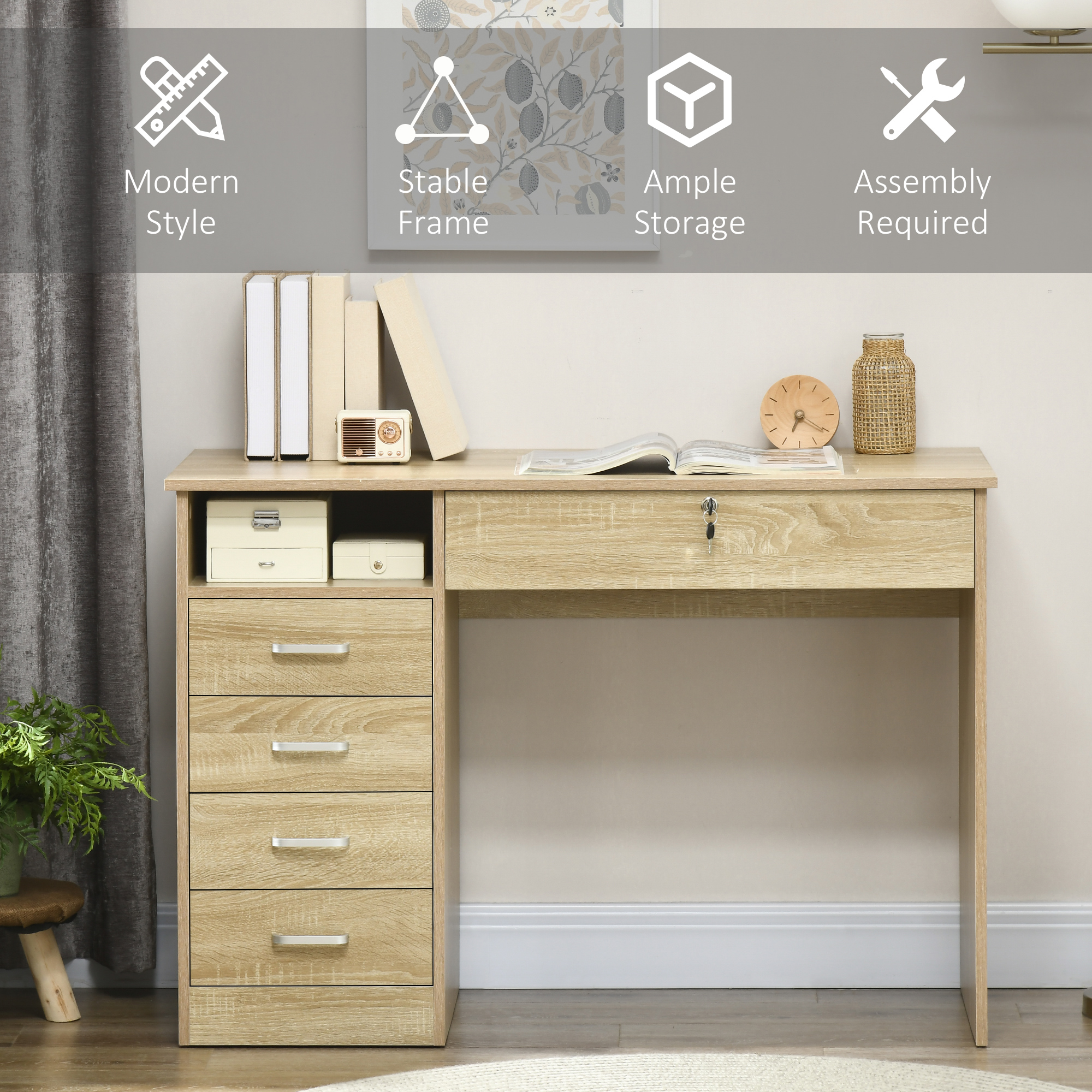 Require space to work and keep all office supplies organised? Then go for this HOMCOM computer desk with drawers. Comes with a wide table top and under-desk space to work from, shelf and five drawers. The below-desk drawer can be locked for security; two keys included. Compact design great for smaller spaces, particle board structure is sturdy and tough. The desk with storage is finished with handles on the left-side drawers to open and close easily.