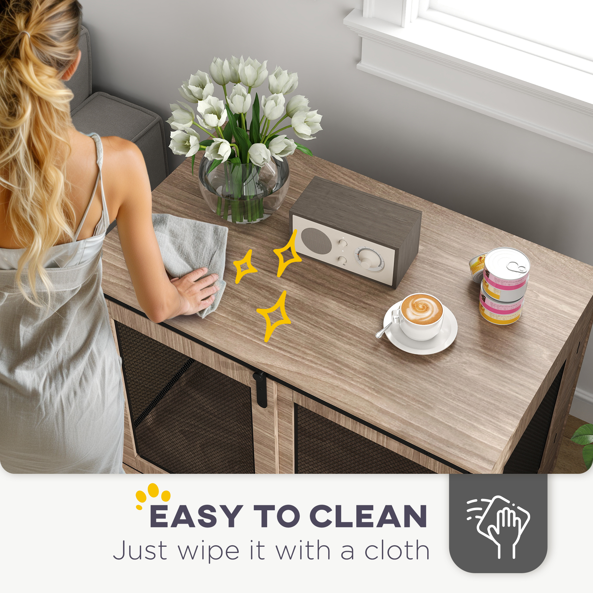 Crate train your pet with the PawHut dog cage, which also serves as a chic side table for your favourite pieces. Made with stable particleboard and a mesh grid to prevent chewing, it ensures airflow and visibility so your dog won't feel trapped. Featuring two doors, including a barn-style door, it's easy to access. With a spacious interior, it provides a secure and comfy spot for large dogs to stretch and relax.