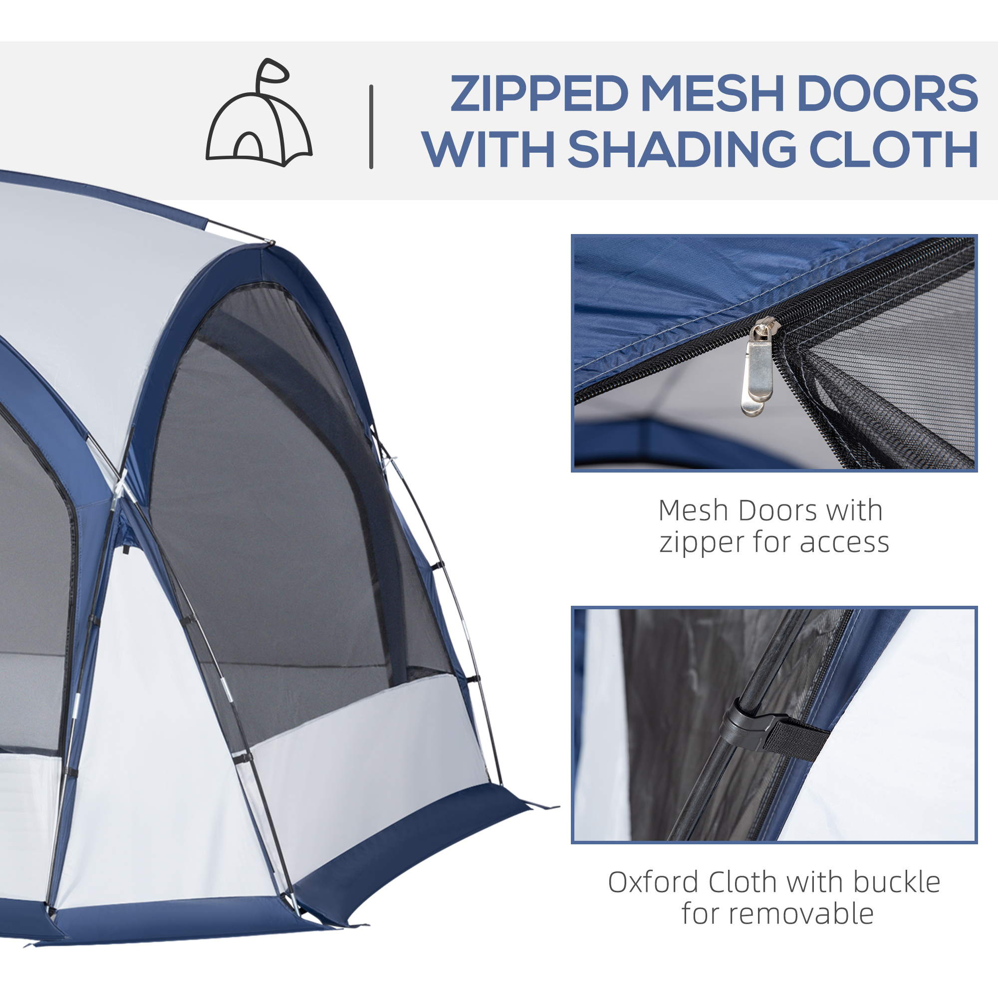 Whether you want an open or closed atmosphere on your camping, festival and outdoor adventure trips, it's easy to do it with this 8 man tent from Outsunny. The large, open design gives room to sleep and keep bags altogether. The four mesh walls can create an open and airy atmosphere instantly - perfect for hotter days. Fibreglass poles call for a steady camping shelter, finished with an inner lamp hook to light up inside at night.