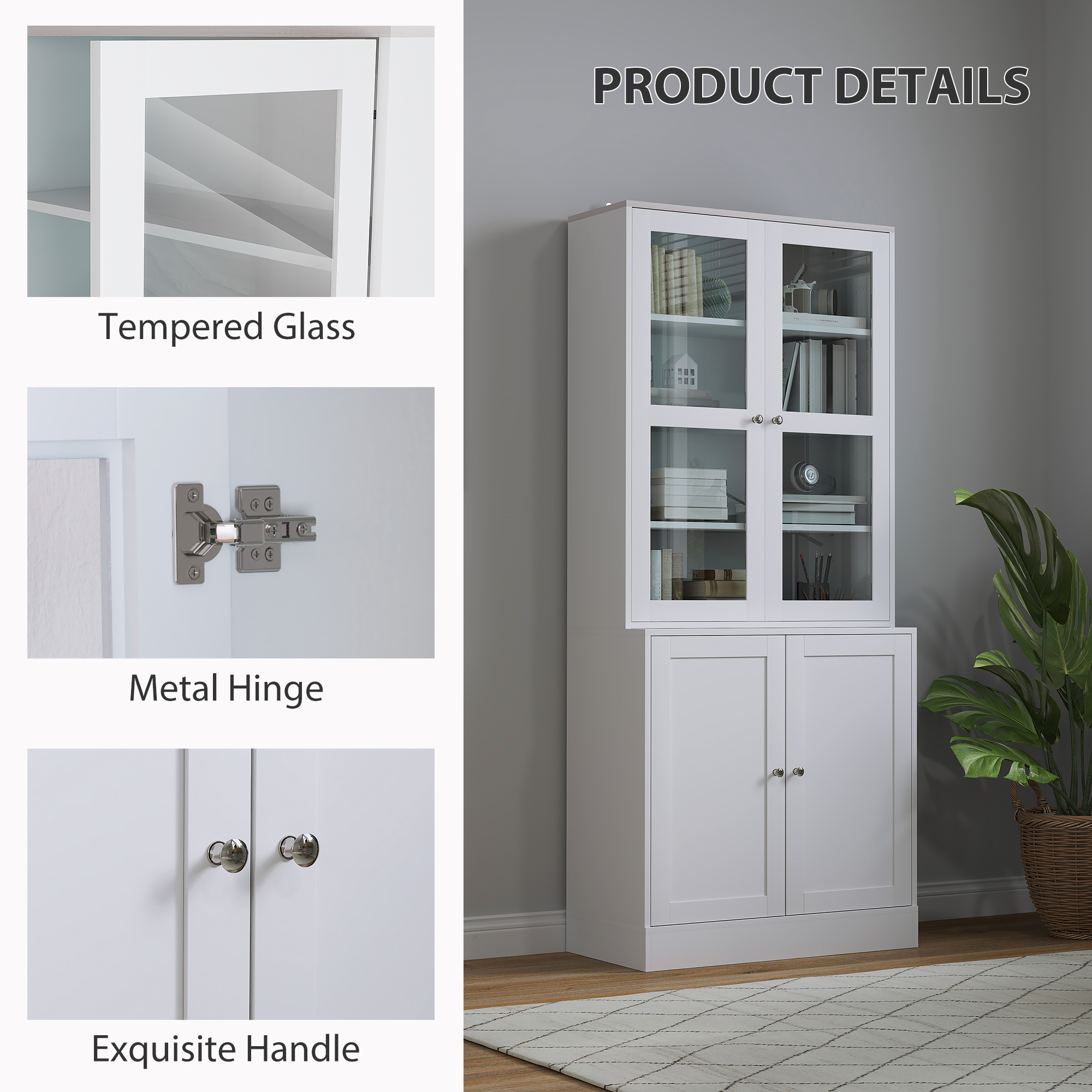 Create a tidy and presentable home with ease - do it with this HOMCOM display cabinet. It's formed of a top cabinet and bottom cupboard for plenty of storage; the upper is fitted with tempered glass doors so you can see through and display your favourite items beautifully. Also inside the top cabinet, there are two adjustable shelves to store items at the position you want. Made from MDF, this unit is stable-great for the everyday, it's finished with safe anti-tipping straps.
