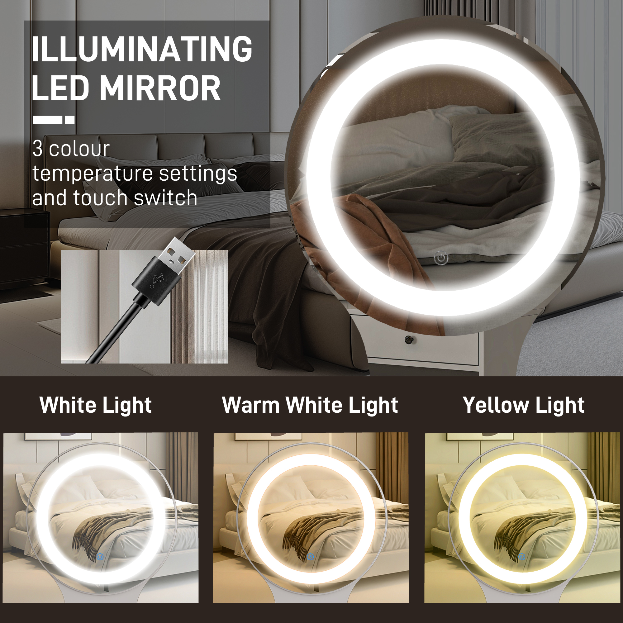 Features: - Round mirror with outer LED light. White, warm white and yellow colour. Controlled by USB (adapter required)