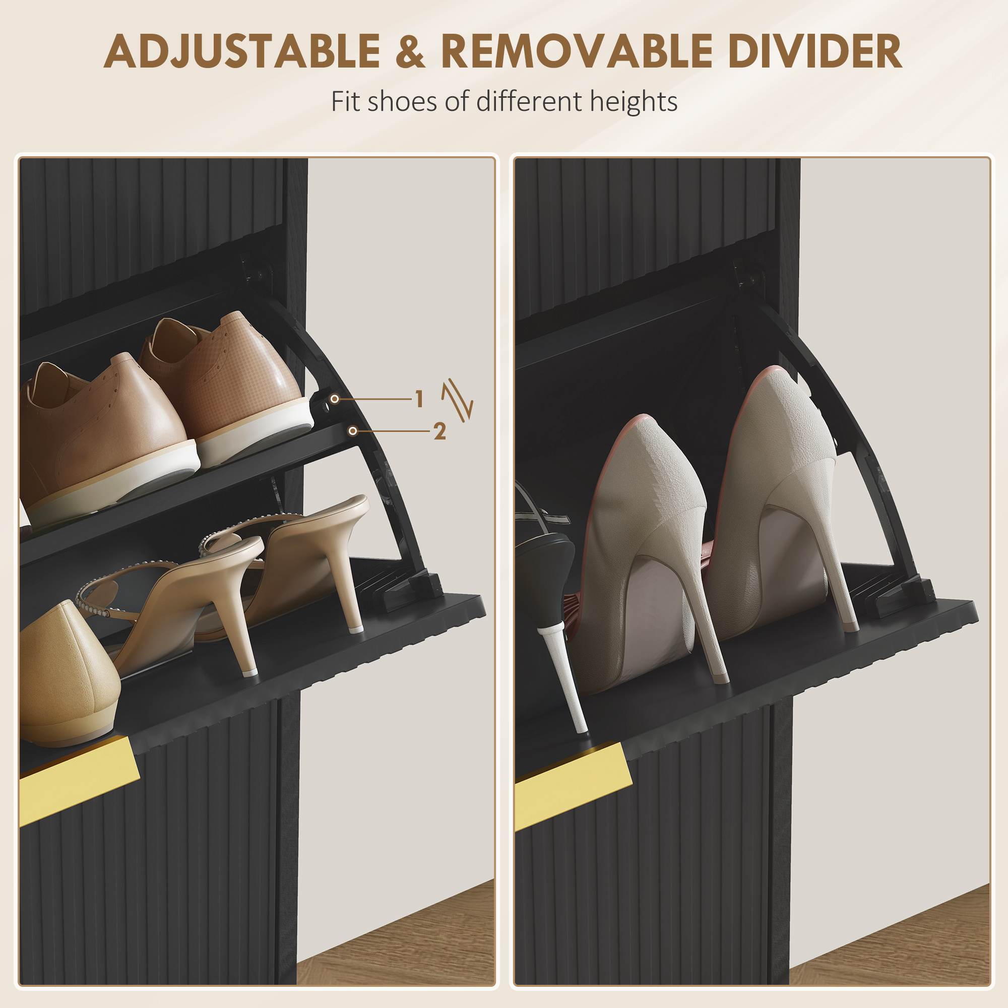 Easy elegance in footwear storage form, with this HOMCOM shoe cabinet. In a soft white hue, it comes with ridged front doors for a touch of texture; complemented with gold-coloured details. It has three drawers, which holds 9-18 pairs of shoe pairs; the adjustable shelf in each drawer makes it easy to fit in differently-sized footwear. Anti-tipping kit included for safety.