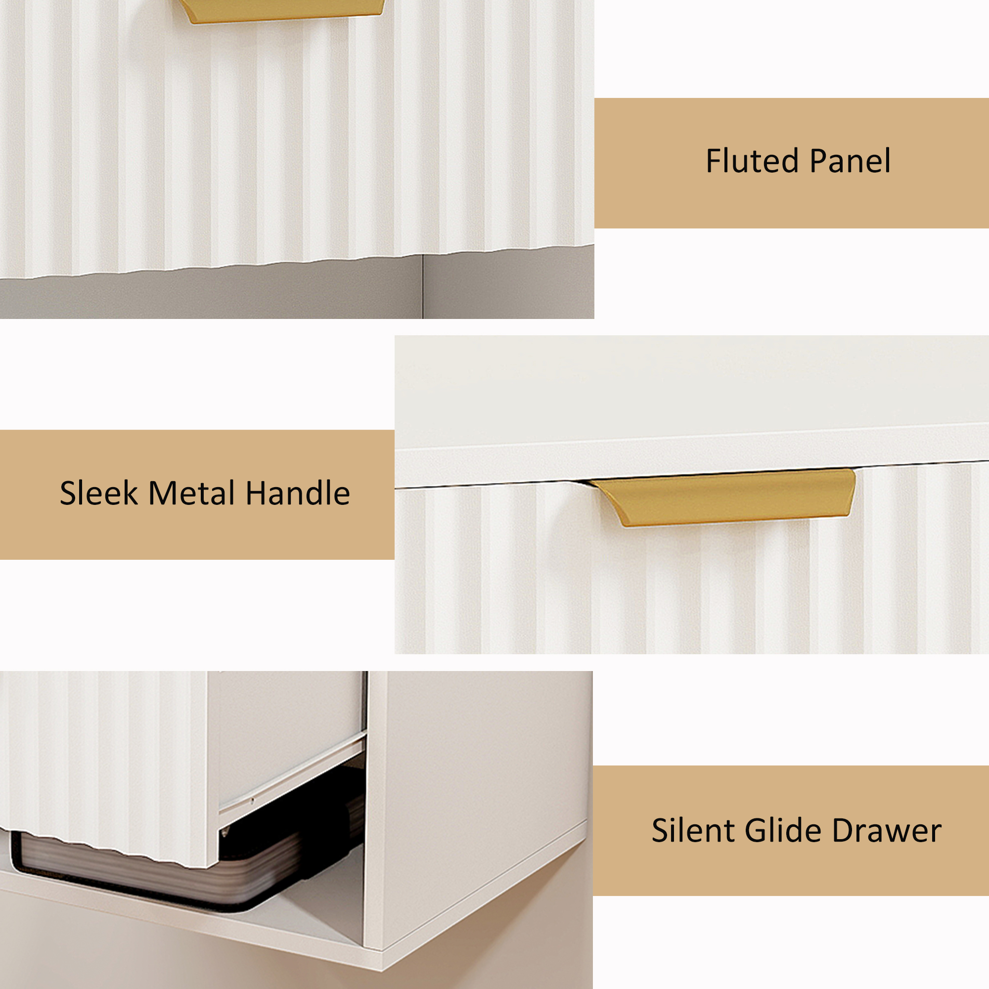 - A fluted drawer panel with a gold tone handle adds a touch of modern luxury