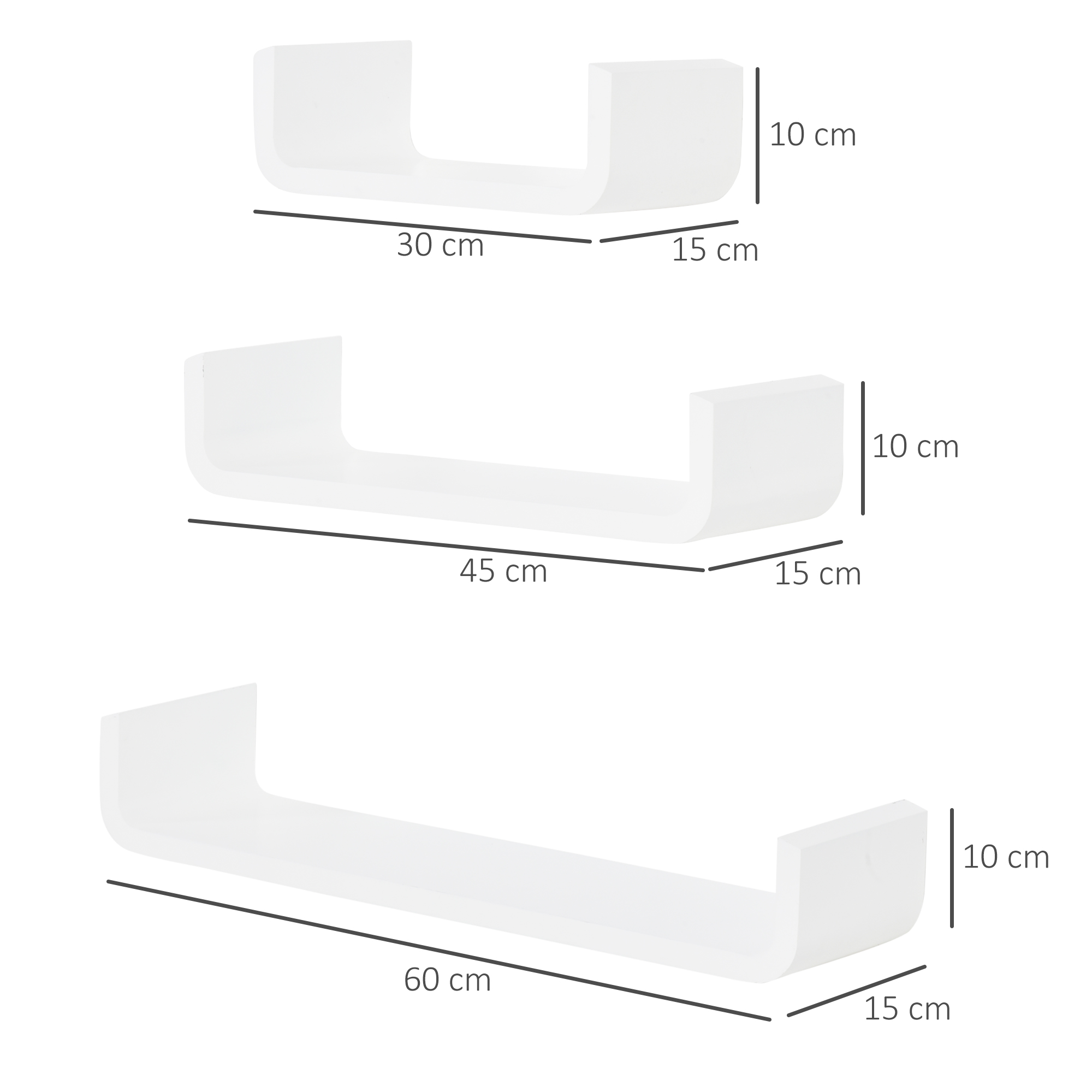 - 3 x Shelf Size: 60L x 15W x 10H (cm), 45L x 15W x 10H (cm), 30L x 15W x 10H (cm)