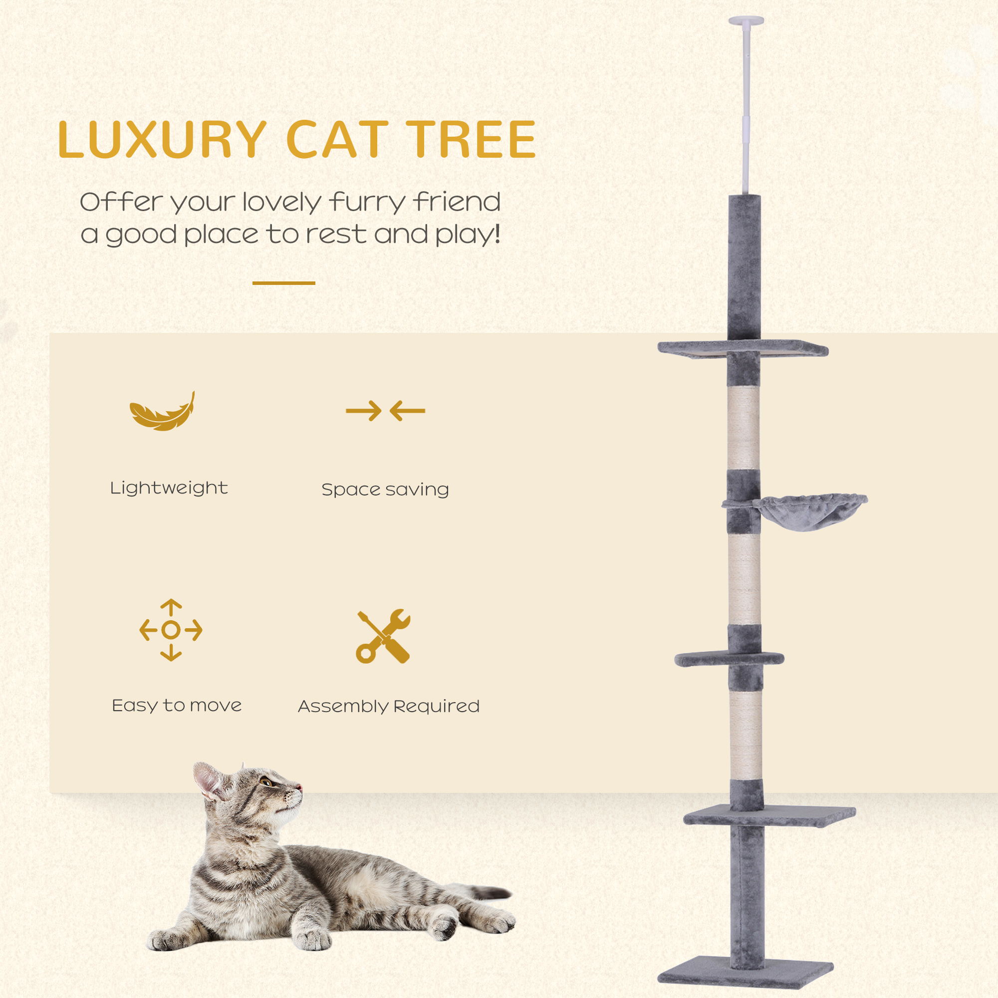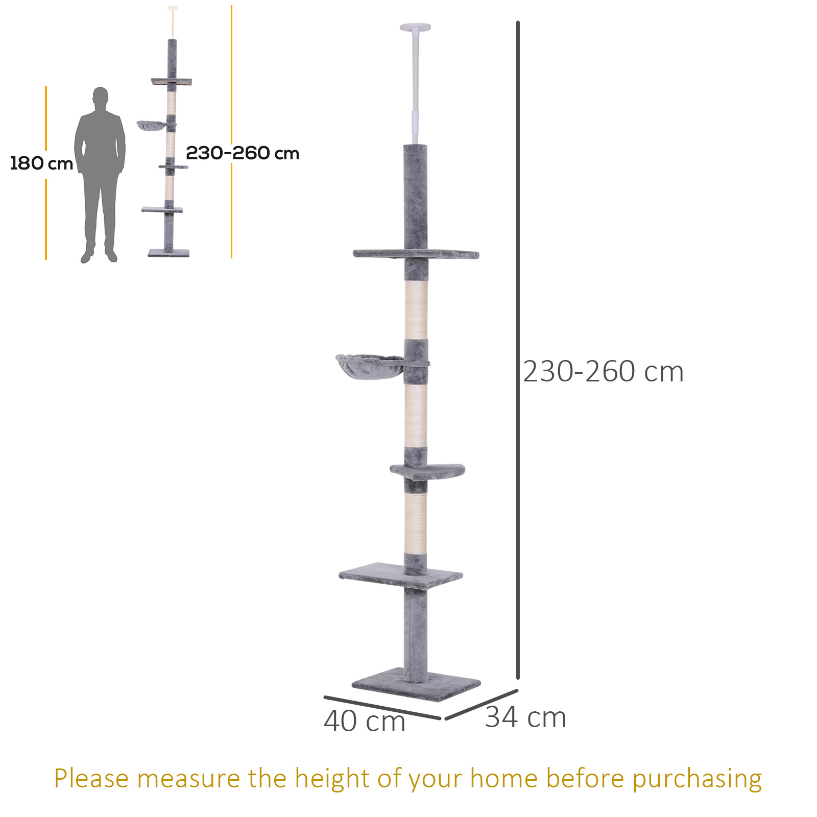 Transform your home into a feline paradise with the PawHut cat play tower, designed for the ultimate comfort and entertainment of your beloved cats. This towering structure, stretching from floor to ceiling, offers five tiers for climbing, lounging, and exploring, ensuring your cats have endless fun while staying active. The integrated scratching post can protect your furniture. Height adjusts from 230cm to 260cm, it seamlessly fits any room, providing a cozy haven for your furry companions.