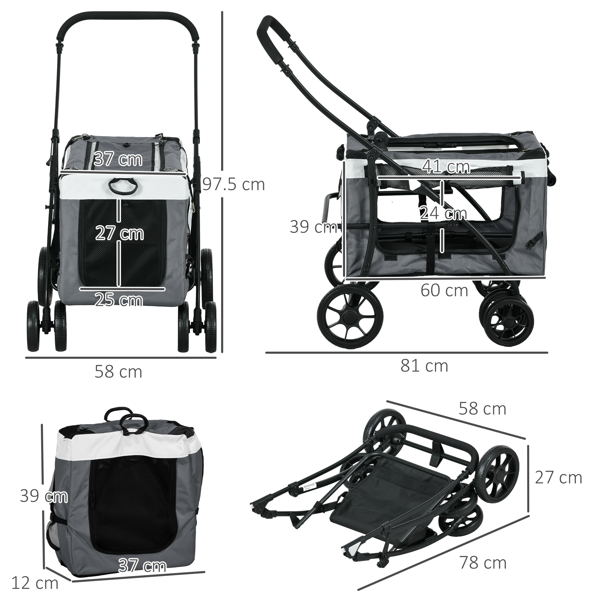 - Dimensions: 97. 5H x 81L x 58Wcm. Main body: 39H x 60L x 37Wcm. Folded frame: 27H x 78L x 58Wcm. Folded carrier: 12H x 39L x 37Wcm. Adjustable safety leash length: 26-51cm. Pouch: 20H x 22Wcm. Padding: 59L x 35W x 2. 5Dcm. Carry strap length: 60-118cm. Front wheel: Φ6". Rear wheel: Φ8”