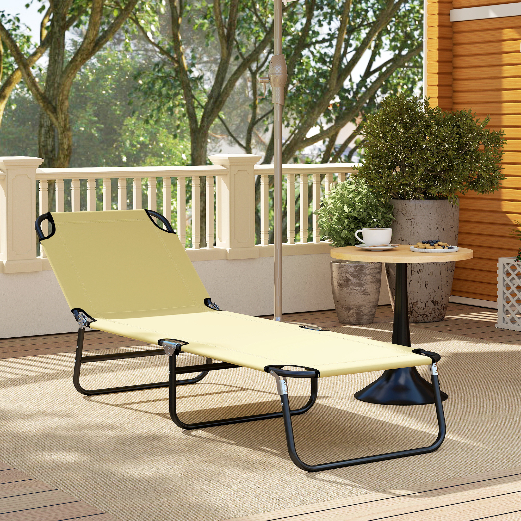 Our Outsunny folding sun lounger is strong, comfortable and will support you all afternoon long. Reinforced metal frames keep you supported - fabric seats are fitted to keep you comfortable. Three long legs keep the lounger balanced. The back can be set to five different positions - choose a position you prefer.