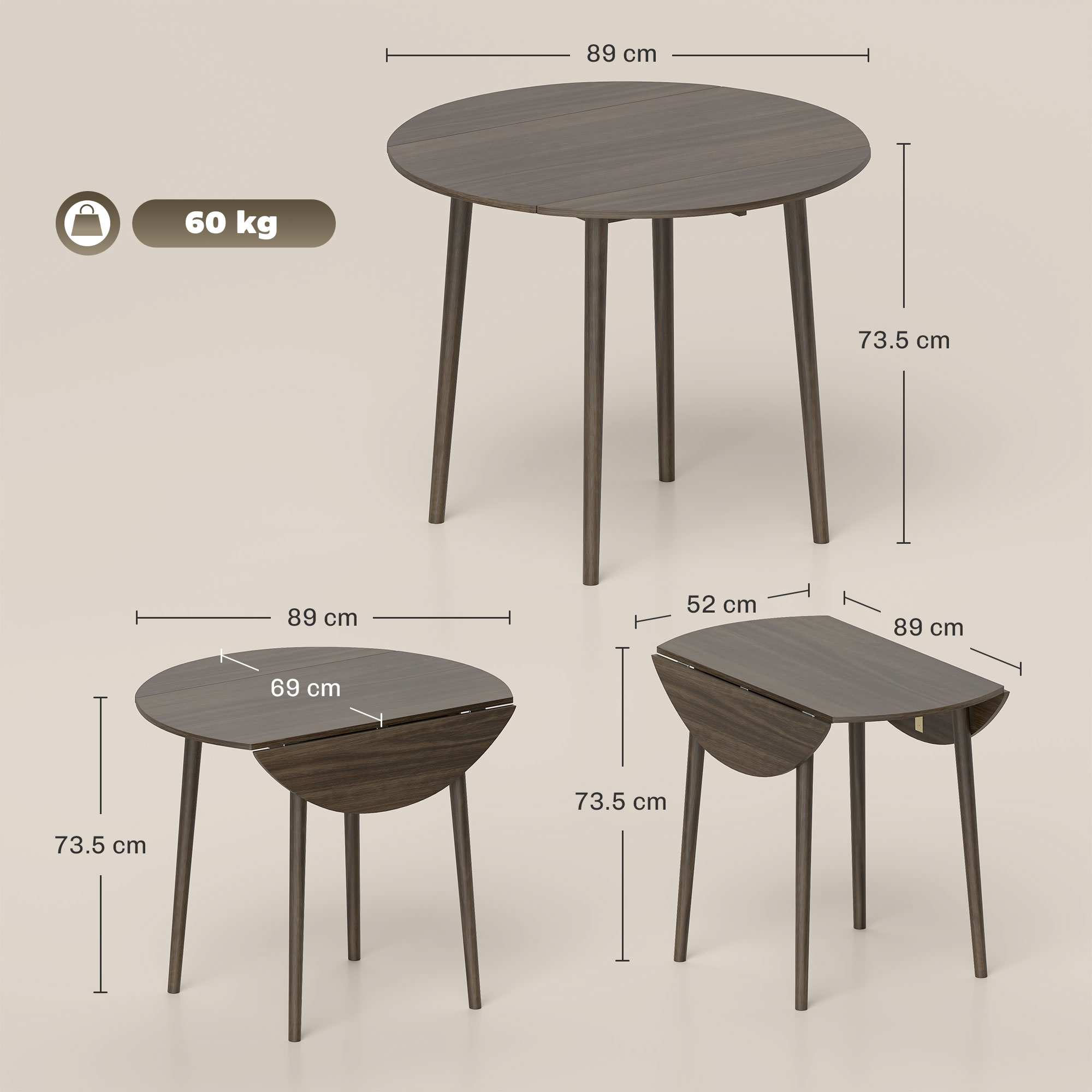 This HOMCOM drop leaf table made from particle board, with wood legs. Two side leaves to expand the space - suitable for smaller and larger spaces. Seats up to four people.