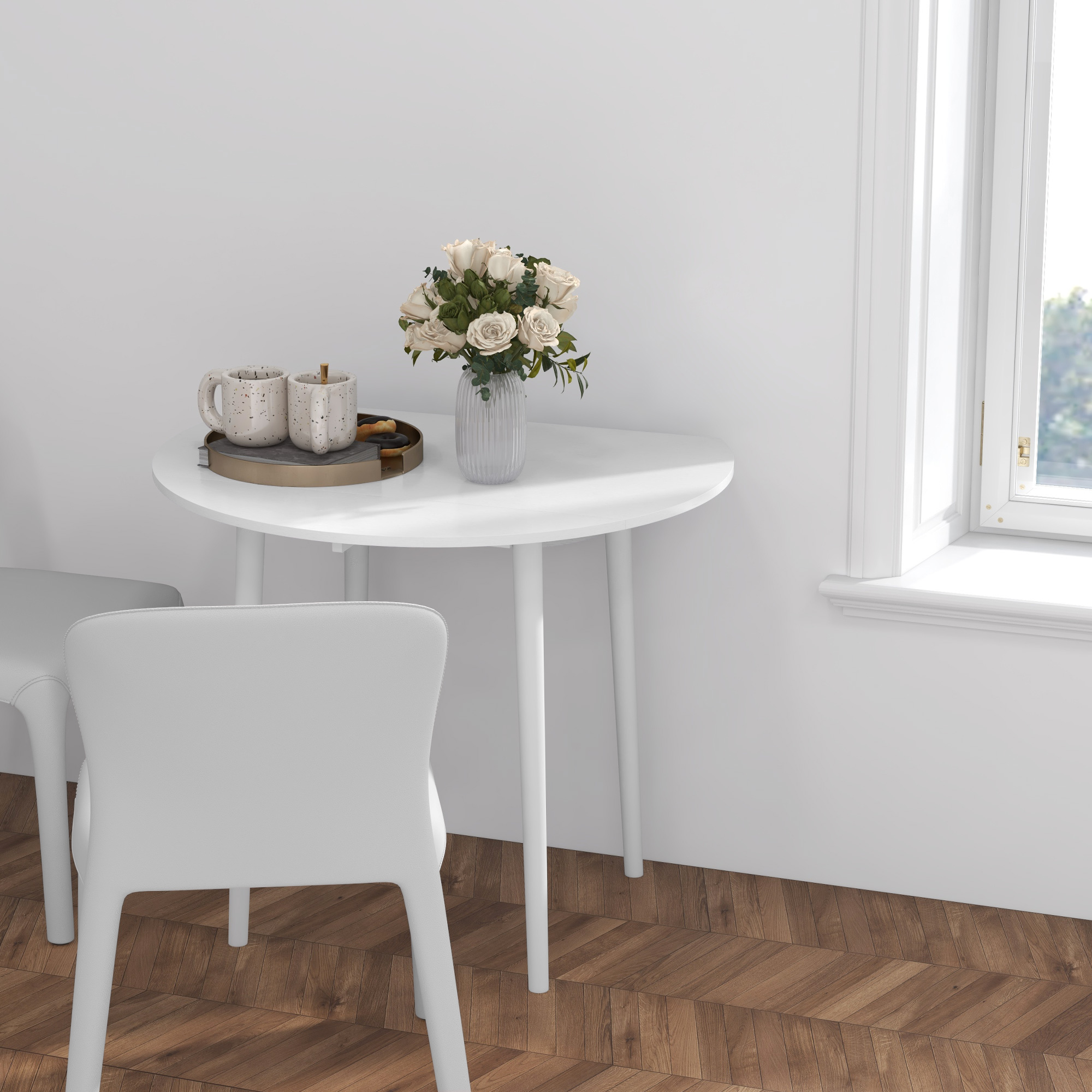 This HOMCOM drop leaf table made from particle board, with wood legs. Two side leaves to expand the space - suitable for smaller and larger spaces. Seats up to four people.