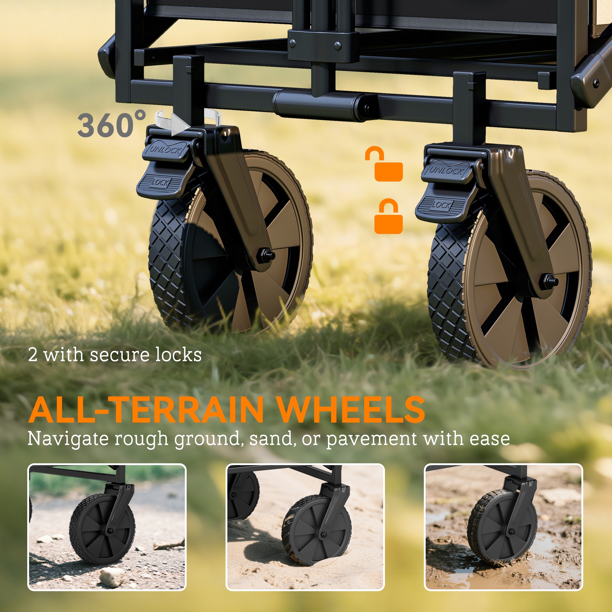 - Four wheels, two of which rotate around fully, to move the cart around on all grounds. Brakes for safety