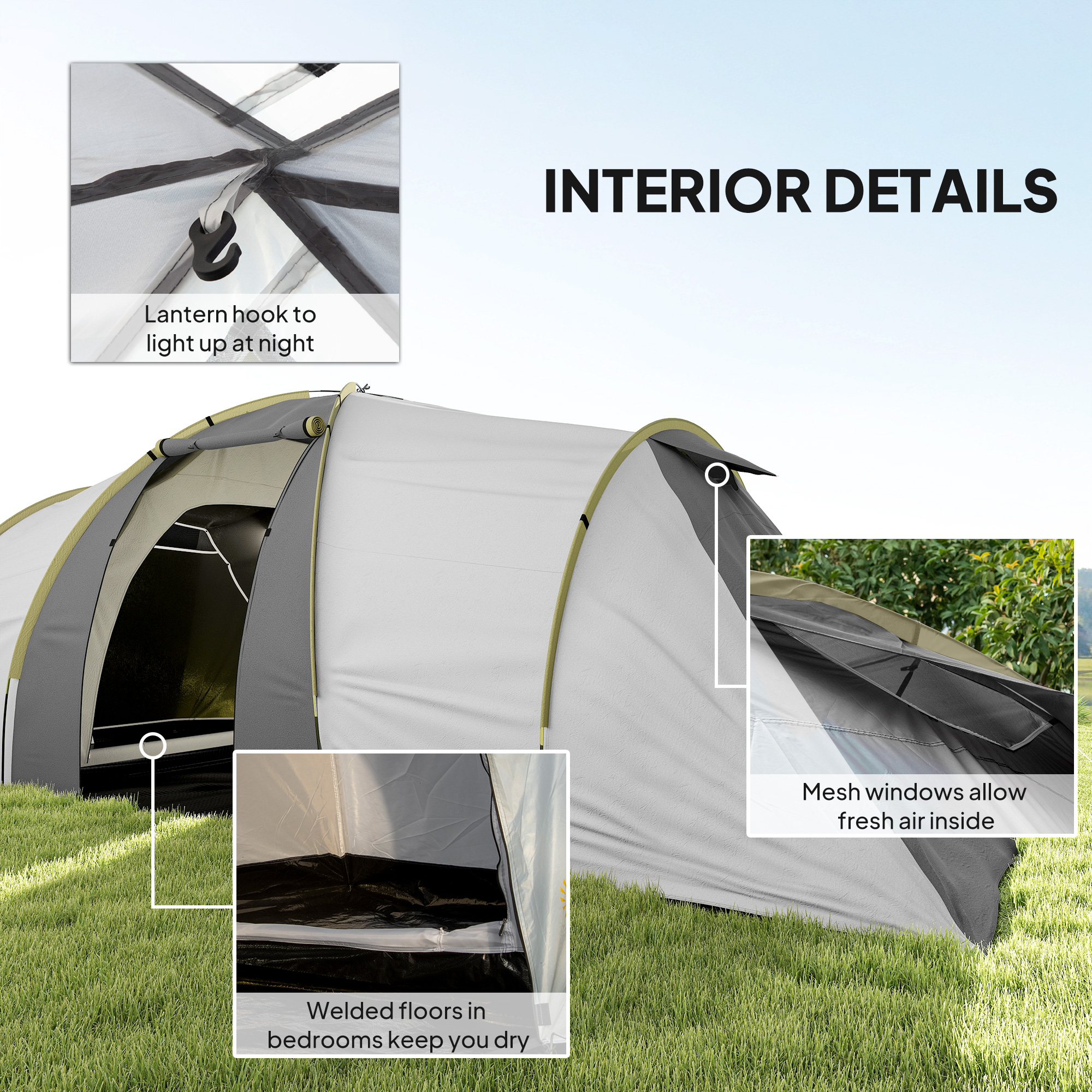 Share the fun of your camping with family and friends - go for this Outsunny four man tent. It comes with two bedrooms, a middle living room and front canopy. Rest and relax day and night, all in a spot. The fabric shell is waterproof up to 2,000mm to shield you in mild weather. Package comes with 32 x ground stakes, 14 x guy ropes and a carry bag.