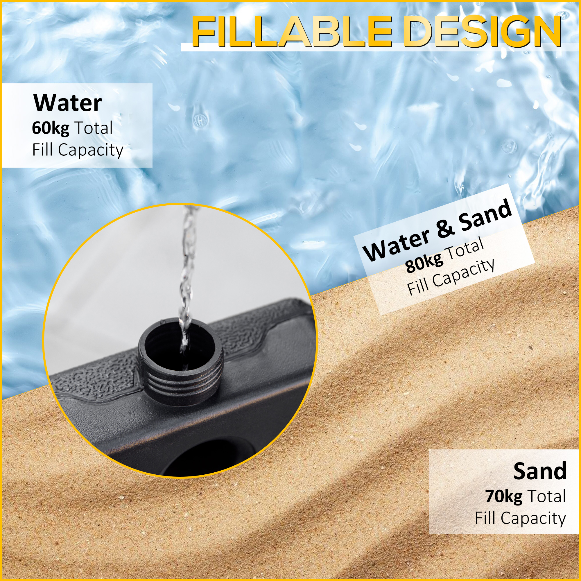 Ensure your parasol is always held firmly in place with these Outsunny weights - suitable our Cantilever and banana parasols. Made from HDPE plastic for year-round use, the four pieces fit together easily with the connecting hooks. Can be filled with either water, sand - or both mixed - to increase the weight easily. Compete with a port and protective cap to fill/empty easily.