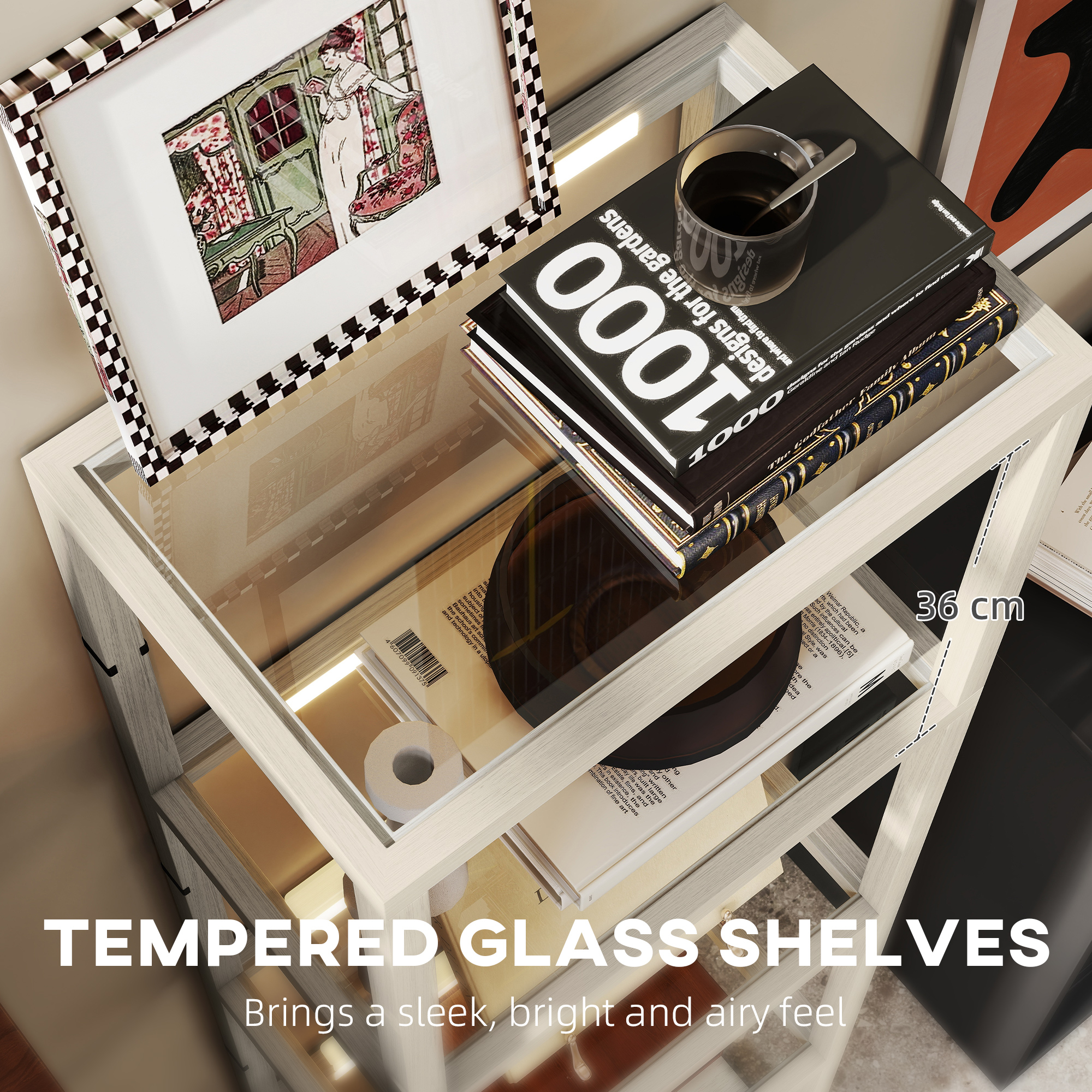 A dash of light for the warm ambience - simply pop this HOMCOM LED floor lamp with shelves into your chosen corner to start enjoying the beautiful illumination. This tall lamp is fitted with warm white LED light lines: 3000 K with three-level adjustable brightness. This bedroom lamp serves as a shelving unit with four-section storage to keep your favourite pieces on show. Tempered glass shelves add a sleek touch and help light transmission. Plug in and step on the foot switch to start enjoying.