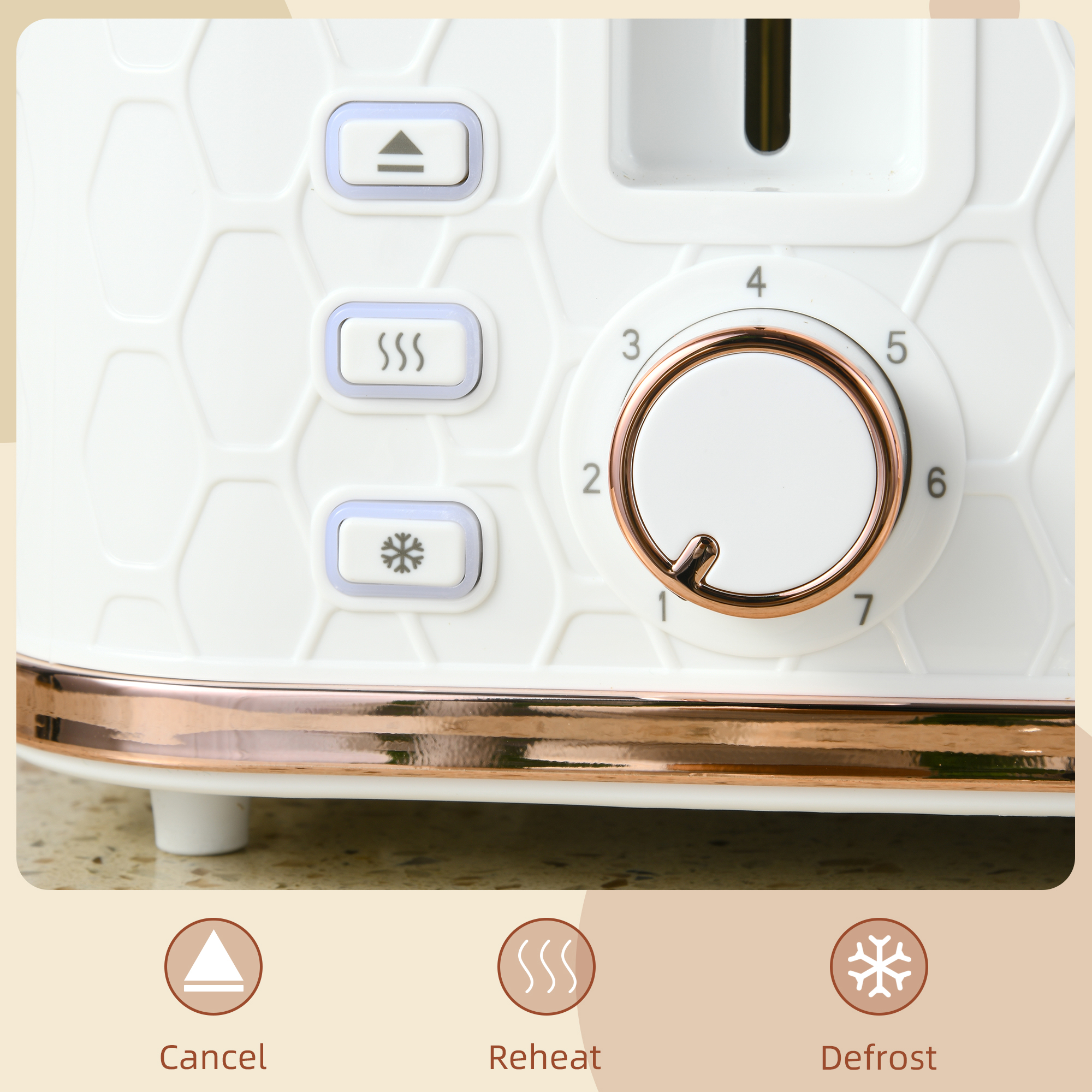 - Reheat, defrost and cancel function, with seven toasting levels: have your toast how you want it