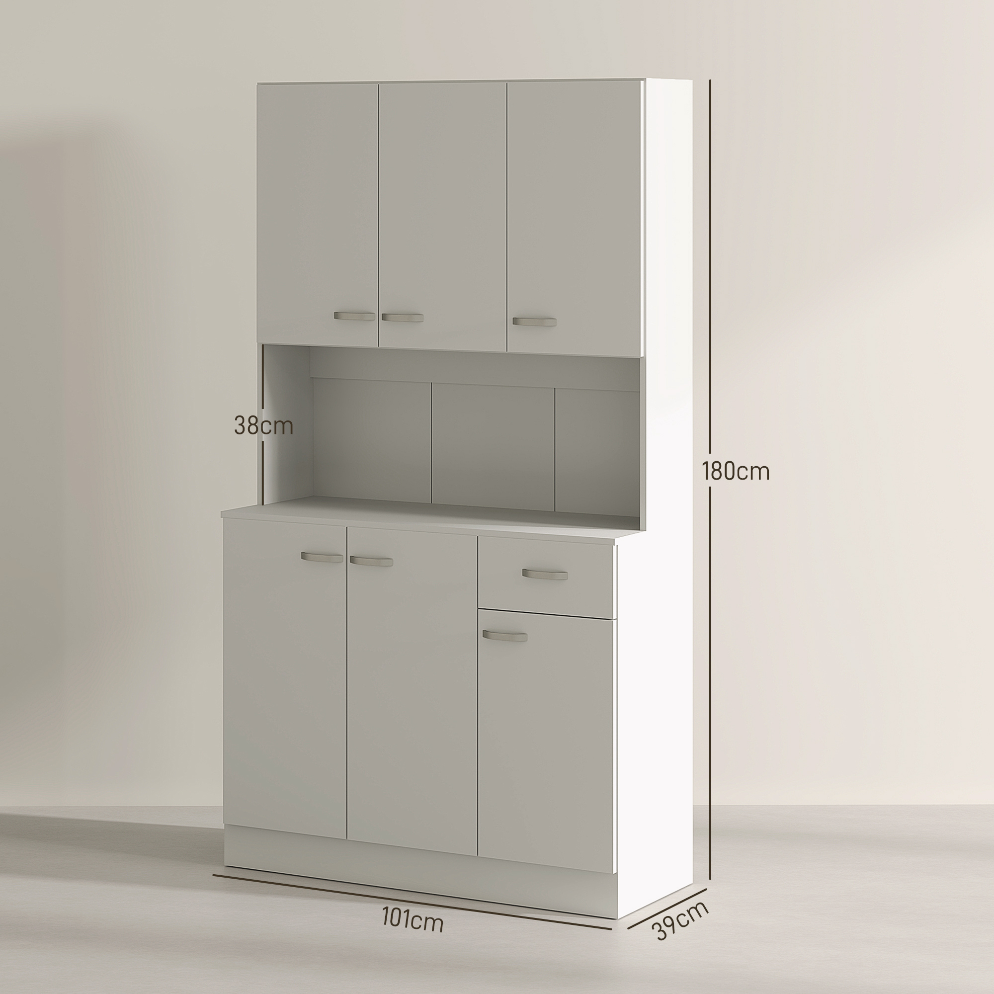 Transform your kitchen into a haven of style and functionality with the HOMCOM freestanding kitchen storage cabinet. This elegant piece maximizes space with its top and bottom cupboards, a drawer, and an open middle shelf. Each cupboard features adjustable shelves, accommodating items of all sizes. The sleek cream white finish and silver handles seamlessly blend with modern interiors, while the anti-tip design ensures safety. Enjoy the harmony of a well-organized kitchen, where every morning begins with ease.