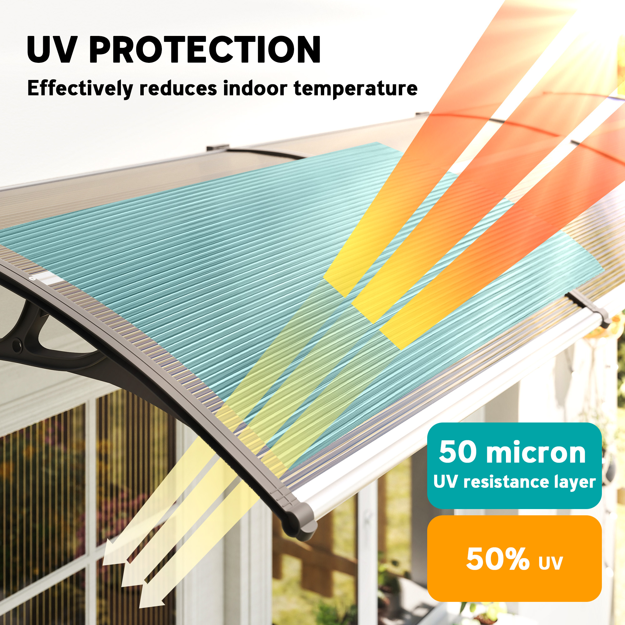 Keep the elements away from your doors and windows, all year long with this Outsunny door canopy. Curved shape covers a larger area, whilst preventing any build-up on the end half. The aluminium frame is strong so it holds on place; it can be easily mounted on the wall with all required accessories included in the package. Each panel features a UV-resistant coating for protection against damaging rays - whether it's sunny, gentle snow, moderate breeze or light-medium rainy.