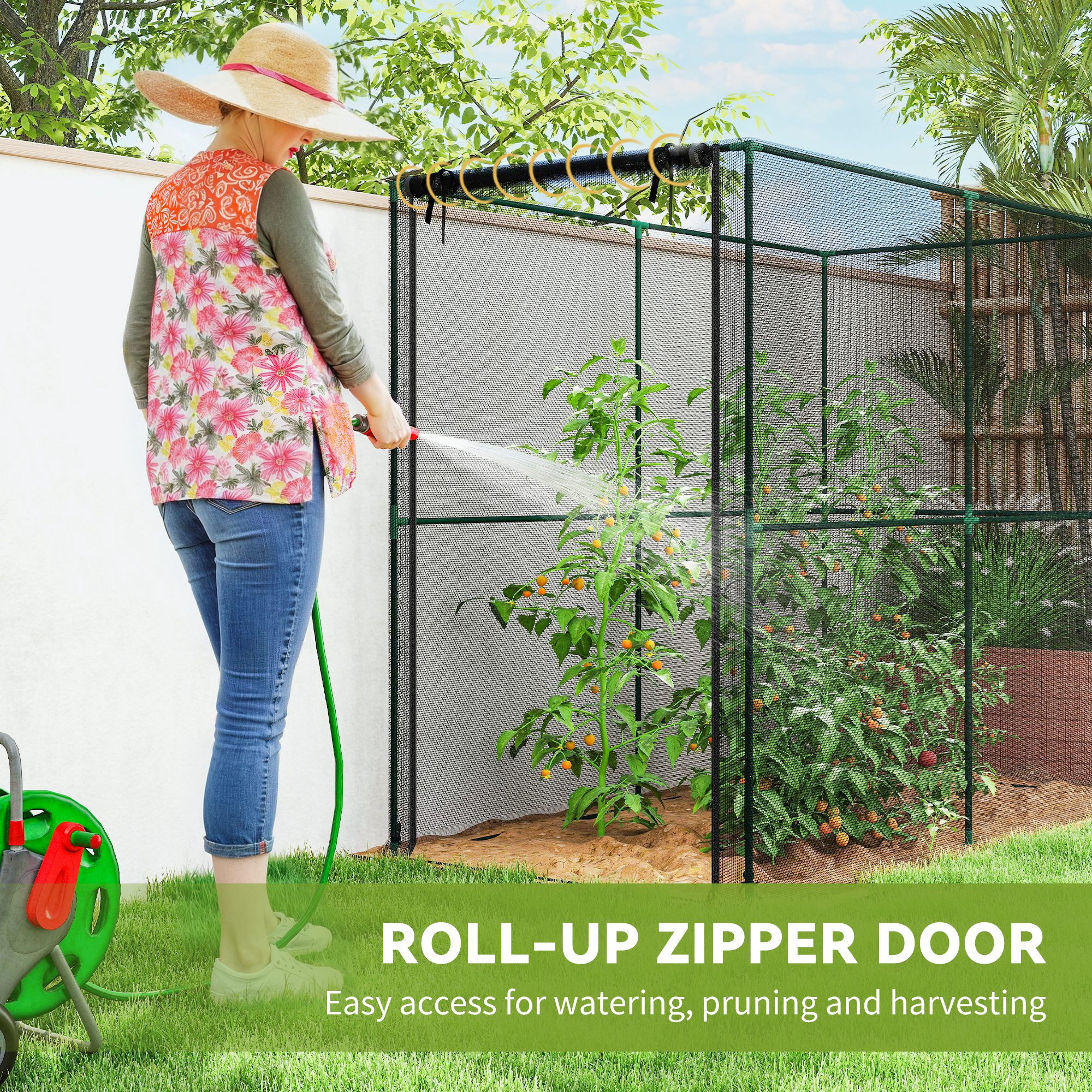 Protect your crops with this spacious Outsunny plant protection cage, designed to shield tomatoes, peppers and climbing plants from birds, rabbits and other garden threats. The reinforced steel frame, ground rods and U-shaped stakes ensure strong stability in outdoor weather. The long-lasting HDPE mesh with extended edges blocks small animals while allowing sunlight, air and rain in. A roll-up zipped door allows you enter easily for watering, pruning and harvesting.