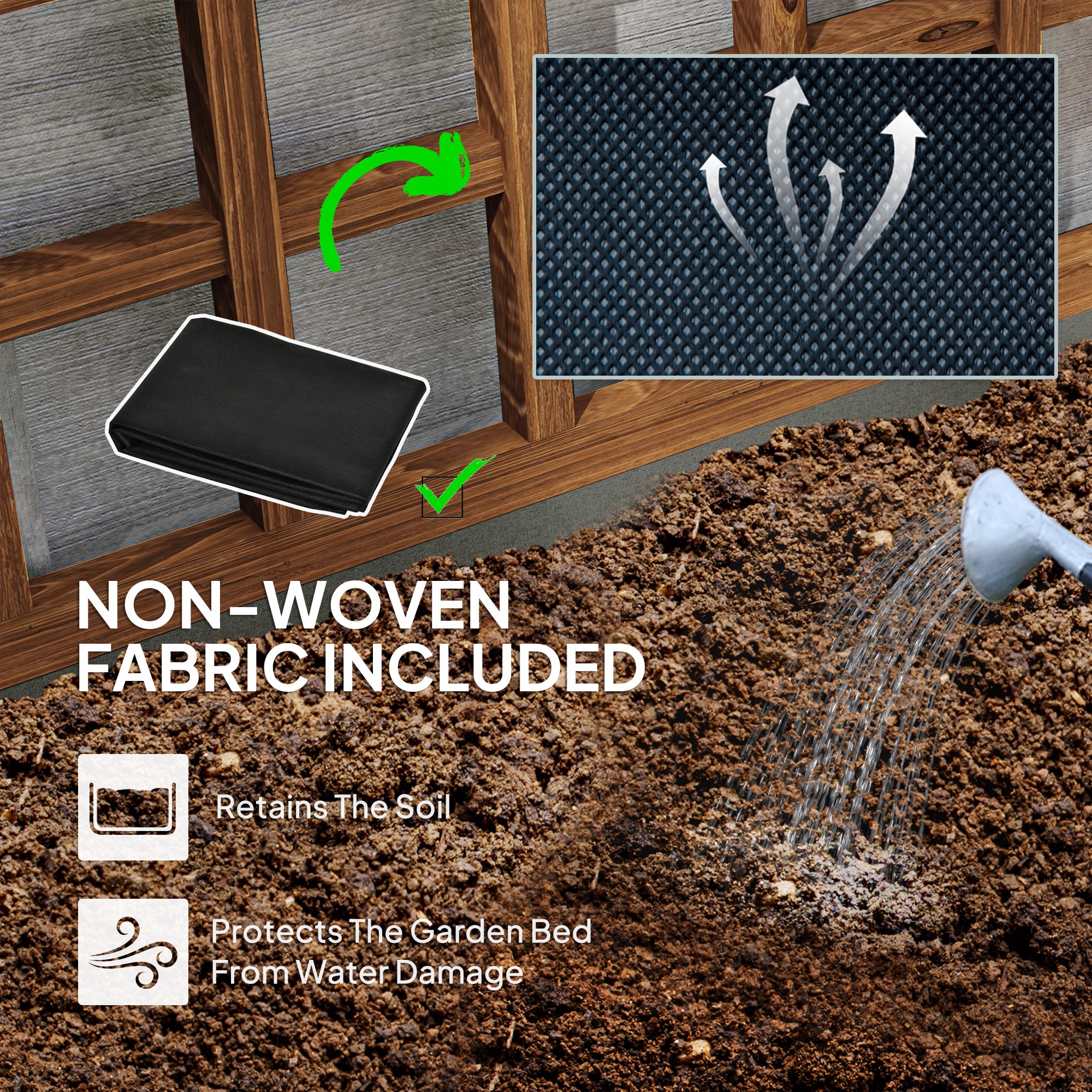 This Outsunny raised garden bed comes with a back trellis - grow plants, flowers, vegetables and let vines and more wrap themselves around the back. Wooden structure makes it strong, with a paint coating for gentle protection. Planter comes with fabric bag to hold the soil together, with two small holes for gentle water drainage.