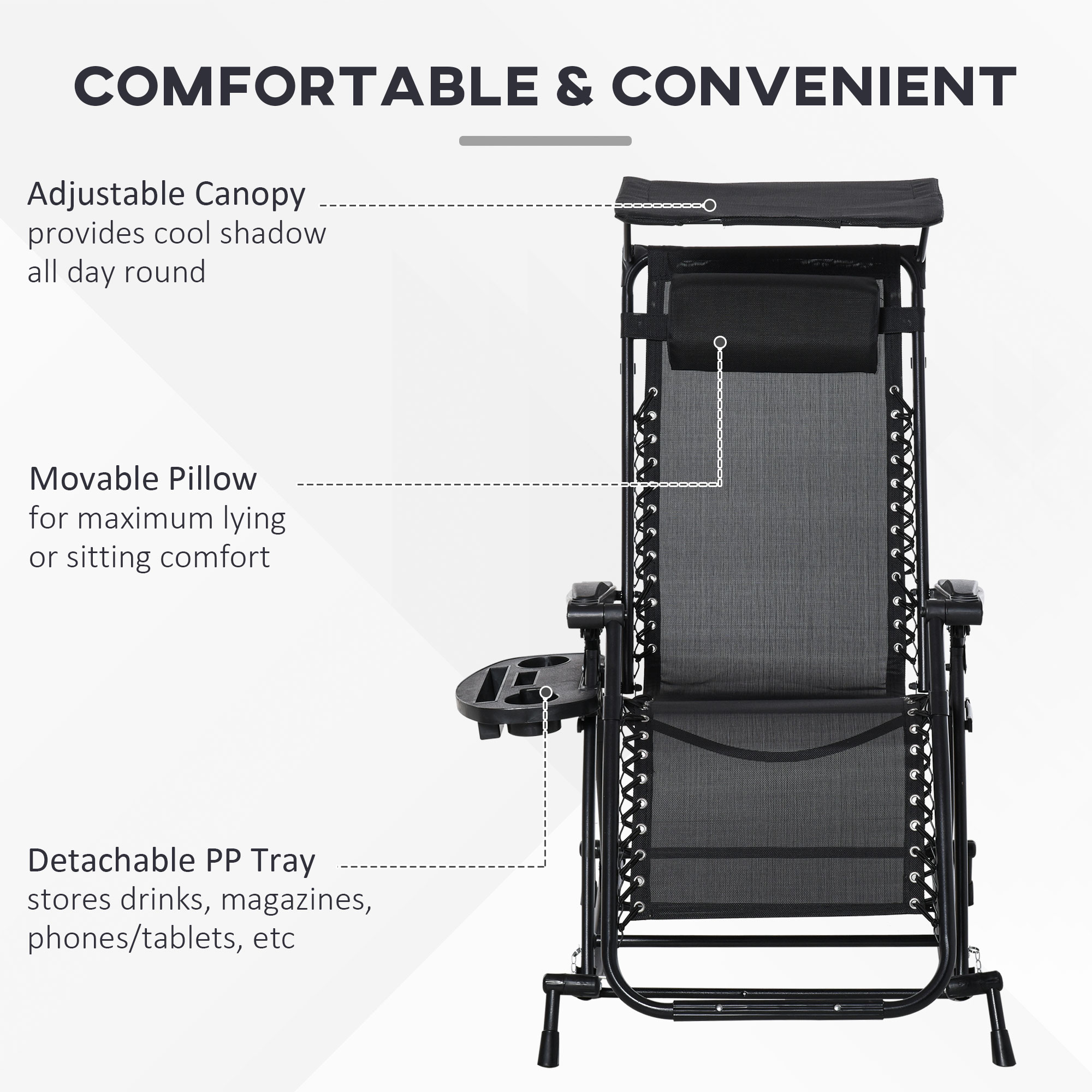 The garden rocking chairs for adults from Outsunny are the perfect gateway to total relaxation in the sun. The powder-coated steel frame forms a tough structure, where the seat is attached to the base for a floating zero-gravity feel. The back freely adjusts between a 10°-35° angle so you can lie back to a position you like. The fabric seat and padded headrest make the garden rocker comfortable, finished with a handy side tray and top canopy to shield you safely.