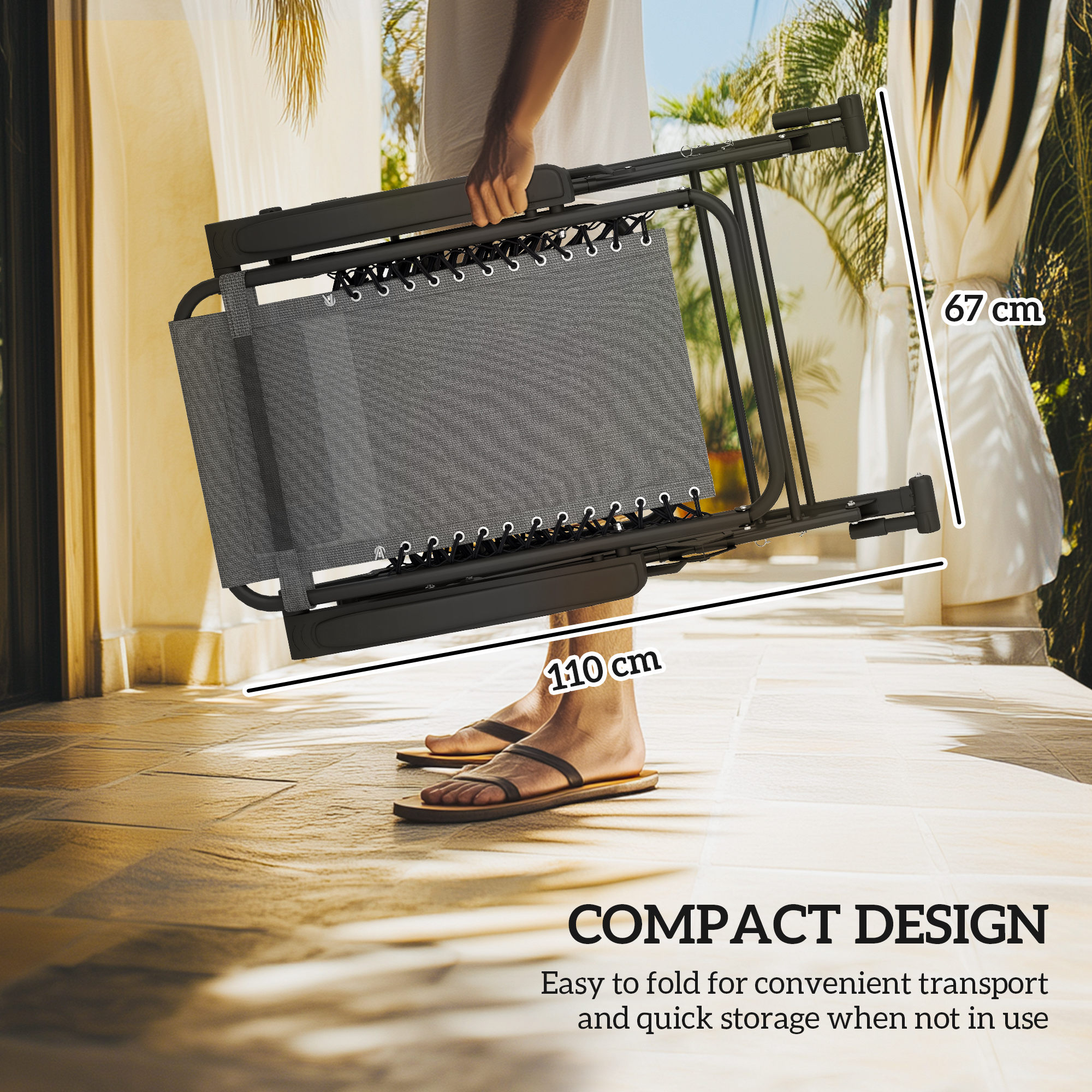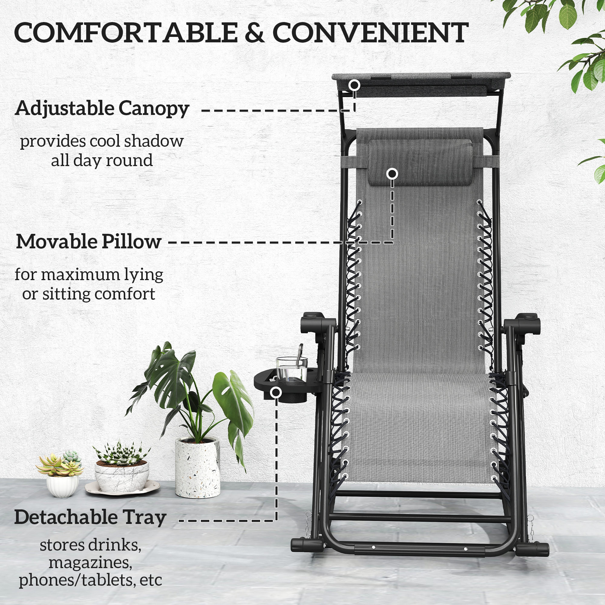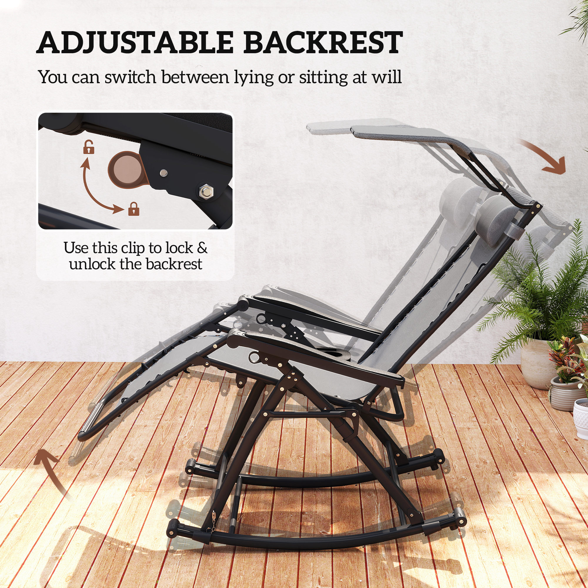 The garden rocking chairs for adults from Outsunny are the perfect gateway to total relaxation in the sun. The powder-coated steel frame forms a tough structure, where the seat is attached to the base for a floating zero-gravity feel. The back freely adjusts between a 10°-35° angle so you can lie back to a position you like. The fabric seat and padded headrest make the garden rocker comfortable, finished with a handy side tray and top canopy to shield you safely.