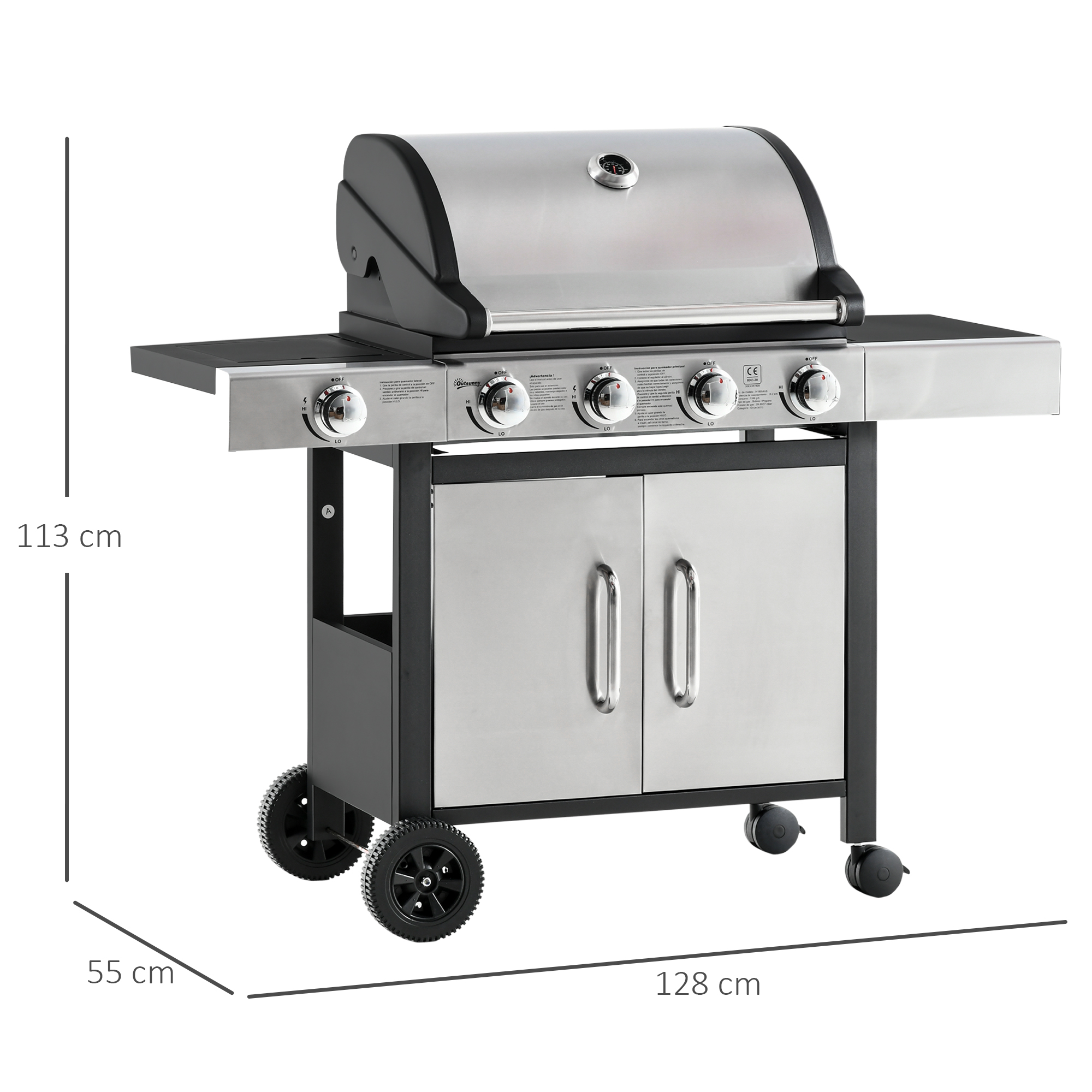 Leave eyes and mouths envious with this super-sleek BBQ grill from Outsunny. This multi-feature outdoor and garden piece is formed of the main enamel BBQ grill with upper warming rack, a side gas burner, cupboard and shelf on each side. Our BBQ smoker is made from a blend of stainless steel and metal for a tough shell, with cool-touch handles to prevent burns. A thermometer fitted on the lid means you can control the temperature better, it's finished with two wheels to move easily.