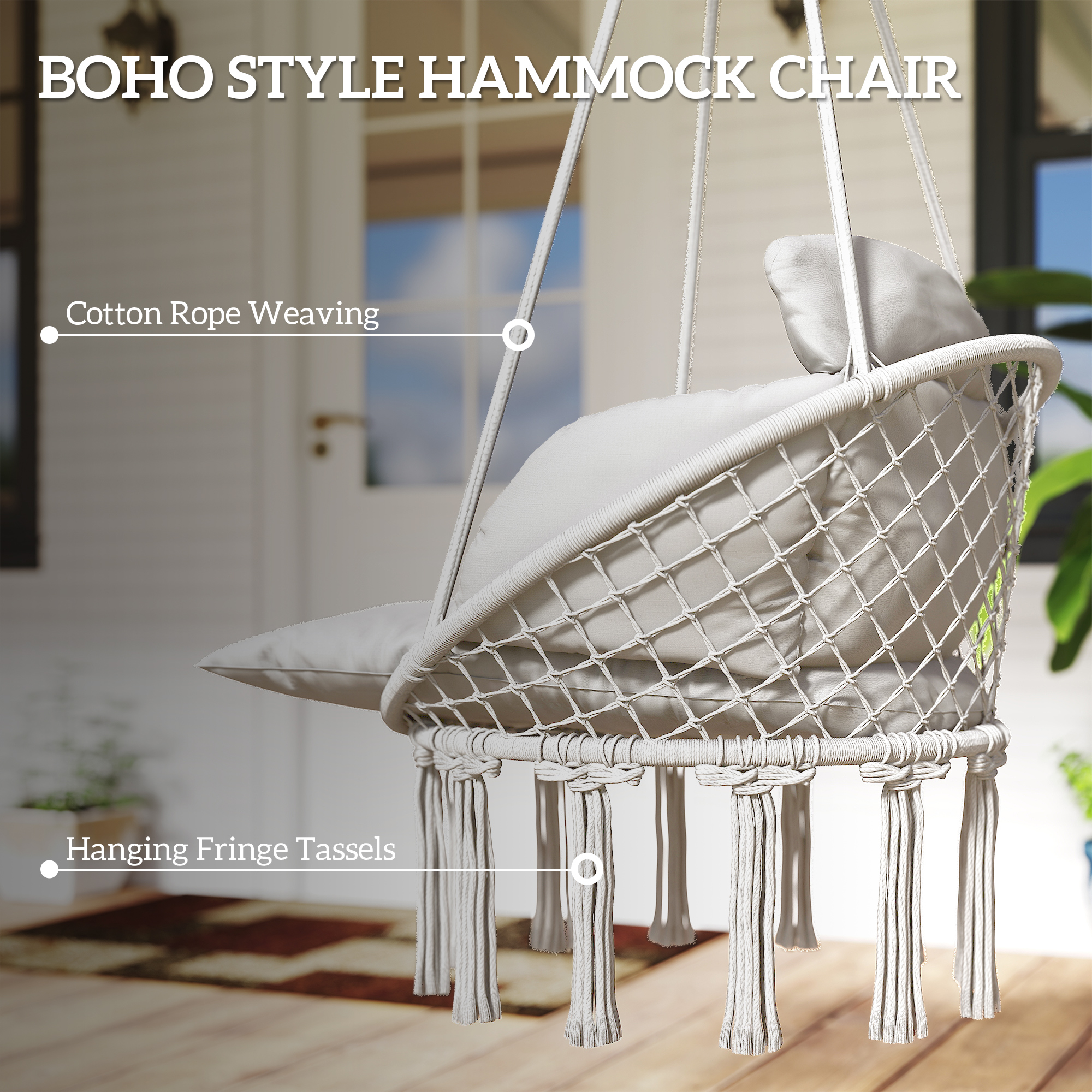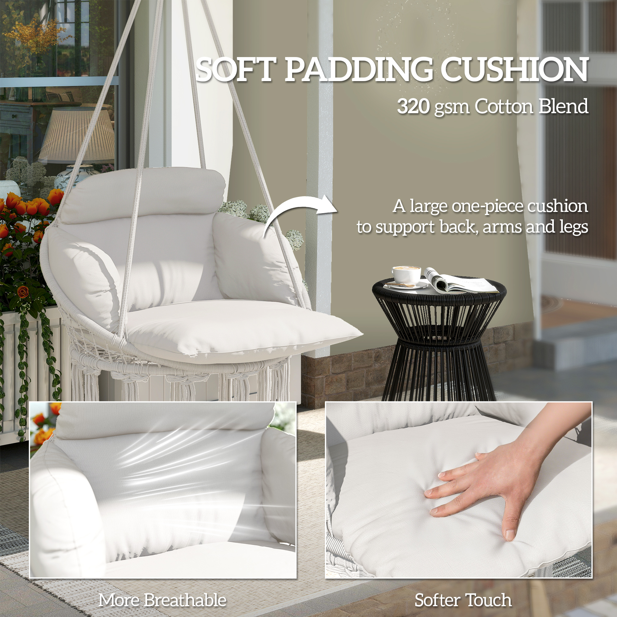 Drift away in the Outsunny hanging hammock chair, a haven of cloud-like comfort with large plush cushion on the outdoor swing chair. 320 gsm polyester cotton fabric offer a more breathable and softer touch. Crafted with a tough steel frame and exquisite weaving, this hanging swing chair offers a safe, relaxing escape. Easy to hang with included hardware, the hammock swing chair is an excellent addition to your indoor or outdoor retreat.