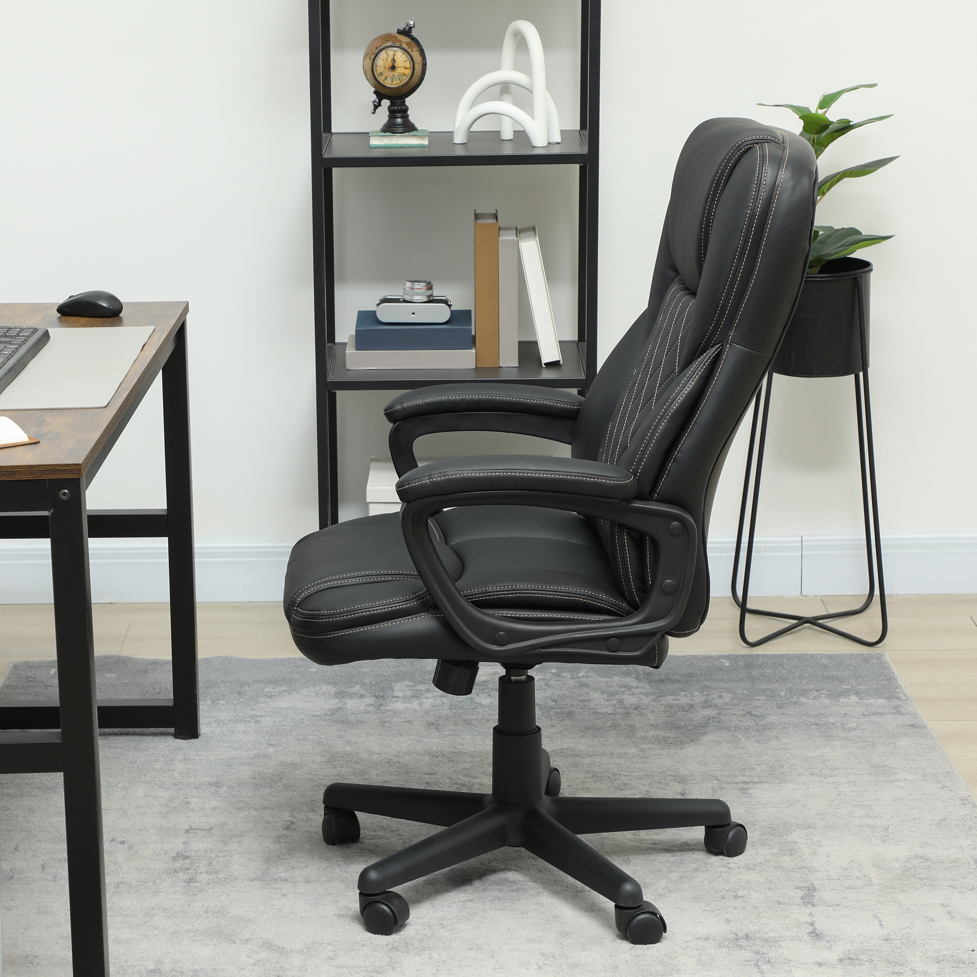 Transform your workspace with the comfy office chair from HOMCOM, where comfort meets luxury. This PU leather office chair cradles your body with a curved high back and thick padded cushions, ensuring comfort throughout your workday. Enjoy the ease of the tilt mechanism and customizable height for a seamless transition from intense focus to relaxation. Wrapped in luxurious and easy-to clean PU leather, the HOMCOM comfortable desk chair is a great upgrade for any home office.