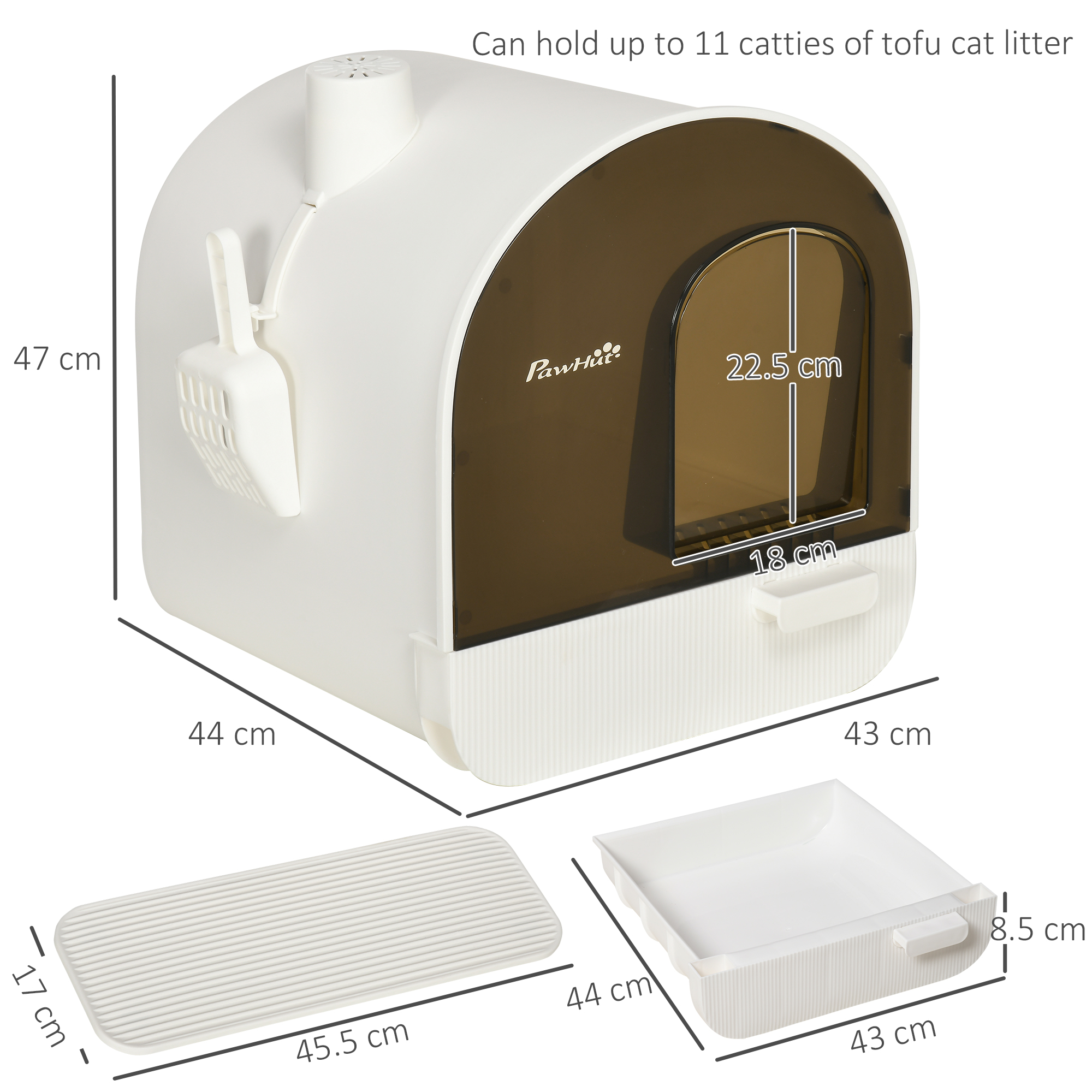 - Dimensions: 47H x 43L x 44Wcm. Inside: 8. 5H x 38L x 34Wcm. Flap door: 18L x 22. 5Wcm. Cat litter pad: 45. 5L x 17Wcm