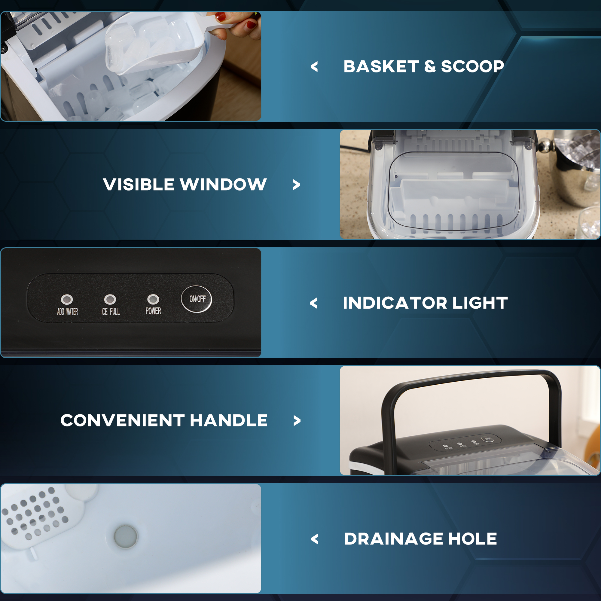 Something every party, summertime and beyond needs: an ice cube maker. Luckily, this HOMCOM one has got you - no matter the space and size you have available. A compact, low working design makes it perfect for practically anywhere - it won't get in the way or annoy you. the 1. 3 litre tank makes up to 12kg ice every 24 hours; that's nine pieces of bullet shaped ice ever 6-12 minutes. Use the window to view how much ice has been made: very easy to see. Comes with handy basket and scoop.