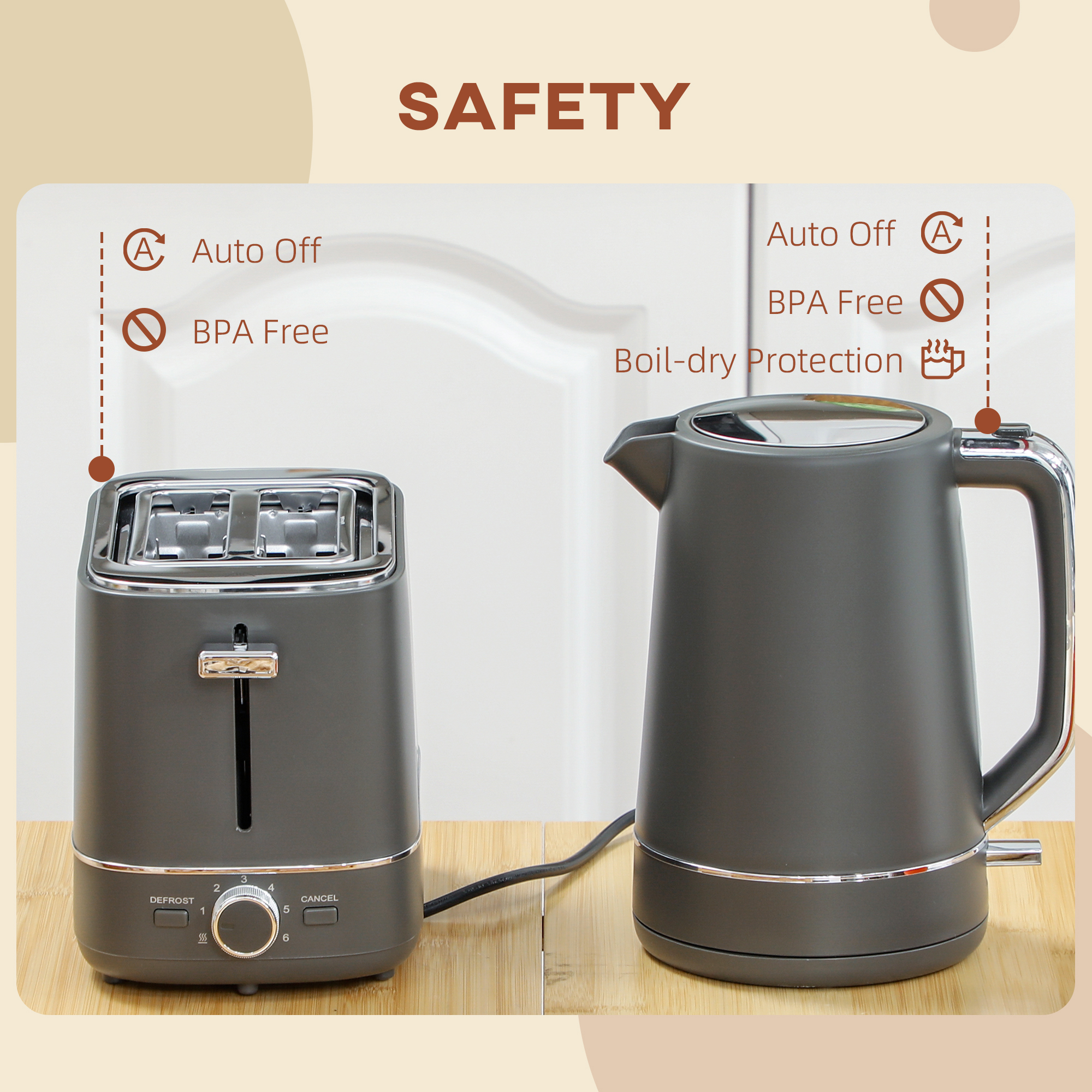- Kettle and toaster include automatic shut-off and made of BPA-free materials for safety. Kettle also has boil-dry protection