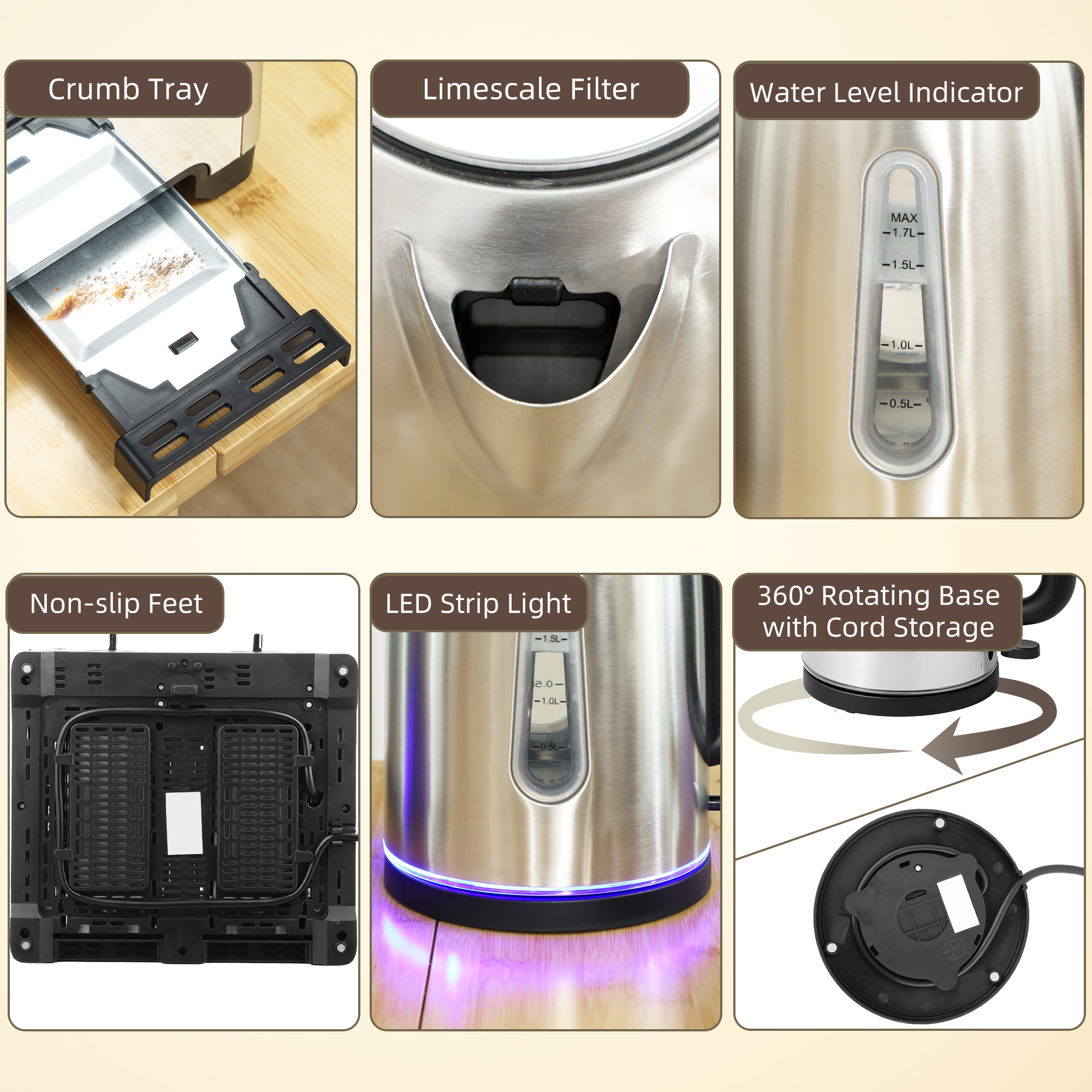 Tired of hectic mornings and a cluttered kitchen? The HOMCOM toaster and kettle set transforms your routine with a sleek, matching design that elevates your counter space. The 1. 7L kettle, equipped with a reliable Strix thermostat, ensures safe, consistent, and rapid boiling for quick coffee or tea, while the four-slice toaster offers seven browning settings for personalised toast—bringing flavour, style, and calm to busy family mornings.
