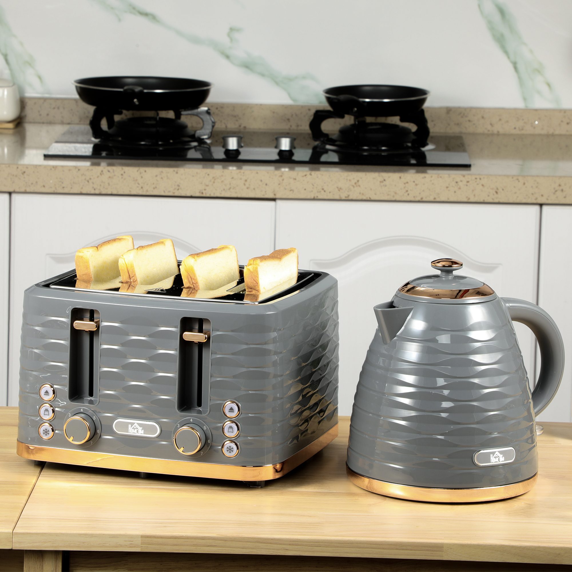 A matching, complementary kitchen starts here, thanks to this HOMCOM set. Comes with a 1. 7 litre rapid boil kettle and four-slice toaster. Both come in ridged texture with glossy finish, complete with chrome-coloured accents for a chic, polished look. The toaster has seven browning levels so you can choose your favourite level. The water kettle can make up to six cups of tea - great for when friends come round and you want a catch up. Hungry and thirsty, anyone?
