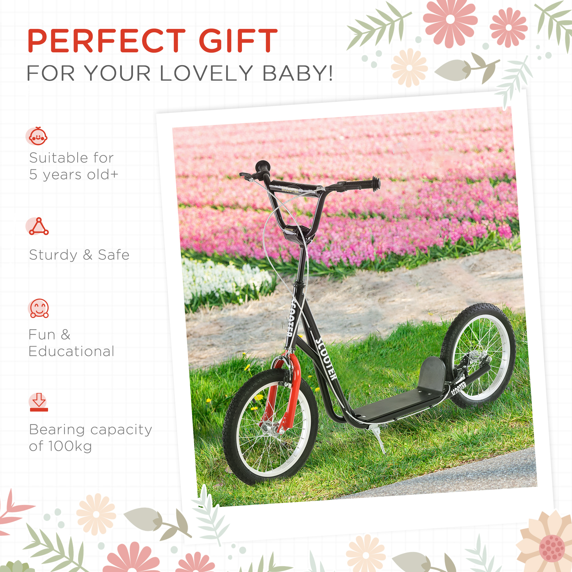 Glide outdoors in style with this scooter for kids from HOMCOM. This scooter with big wheels is made with a front and rear braking system, which allows you to stop immediately while riding along, with the low platform and two big treaded rubber wheels making the journey smooth and enjoyable. Using steel for the structure to handle up to 100kg, the handlebar can be adjusted between 90cm and 96cm so you can set it to a comfortable holding height.