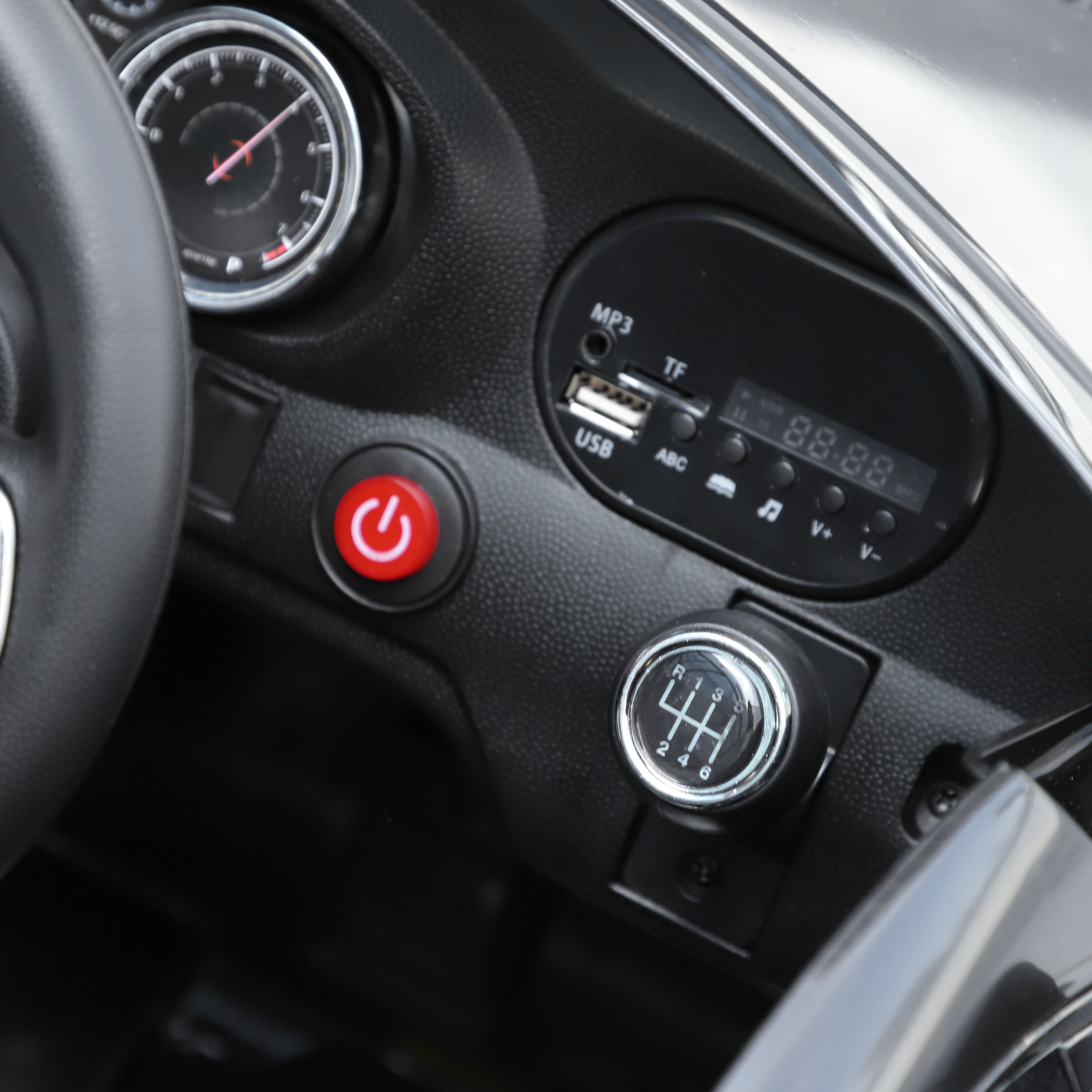 - Horn and music buttons on the steering wheel with both USB and TF card connection