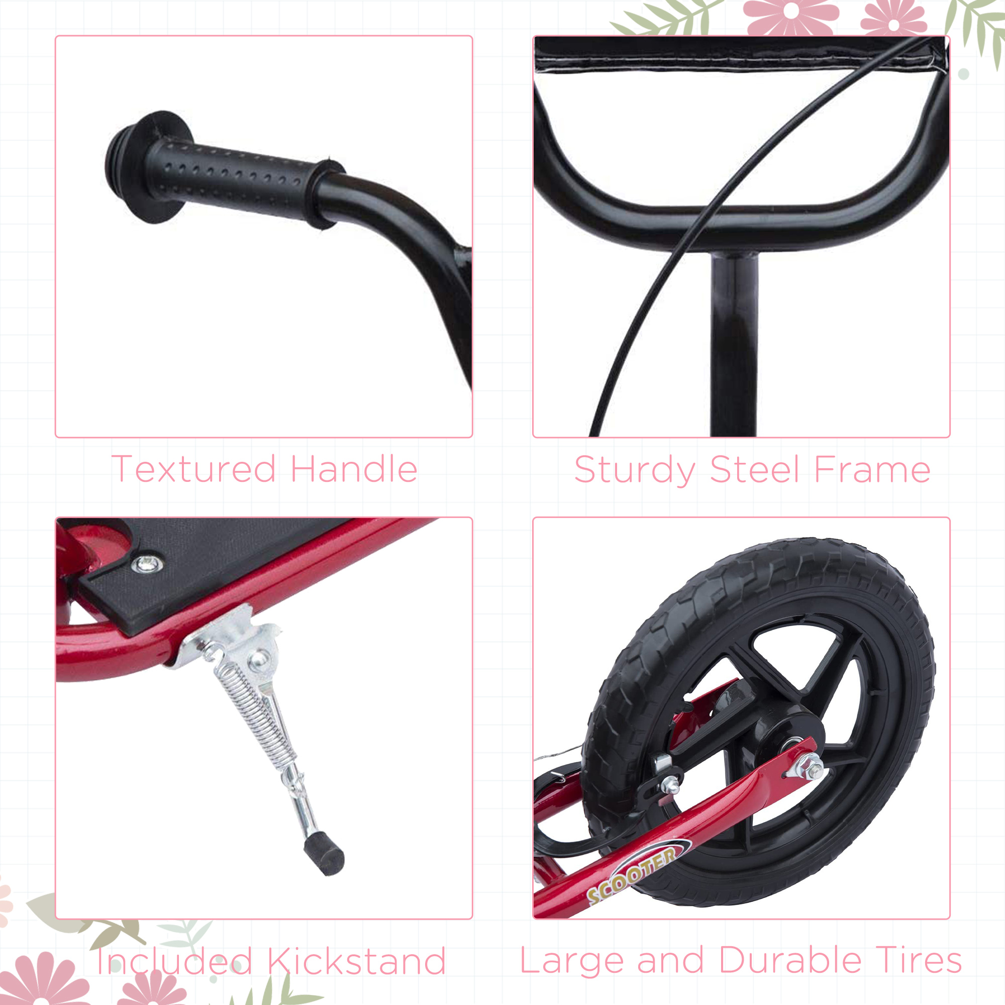 An outdoor classic, this HOMCOM kids scooter delivers fun and excitement with every ride. Suitable for ages 5-12, the adjustable handlebars grow with your child for long-term use. Its solid steel frame, wide non-slip foot deck and responsive rear brake keep rides safe and steady. With smooth-rolling 12" wheels, it's great for school runs, park adventures or just cruising the street – wherever they go, the fun follows.