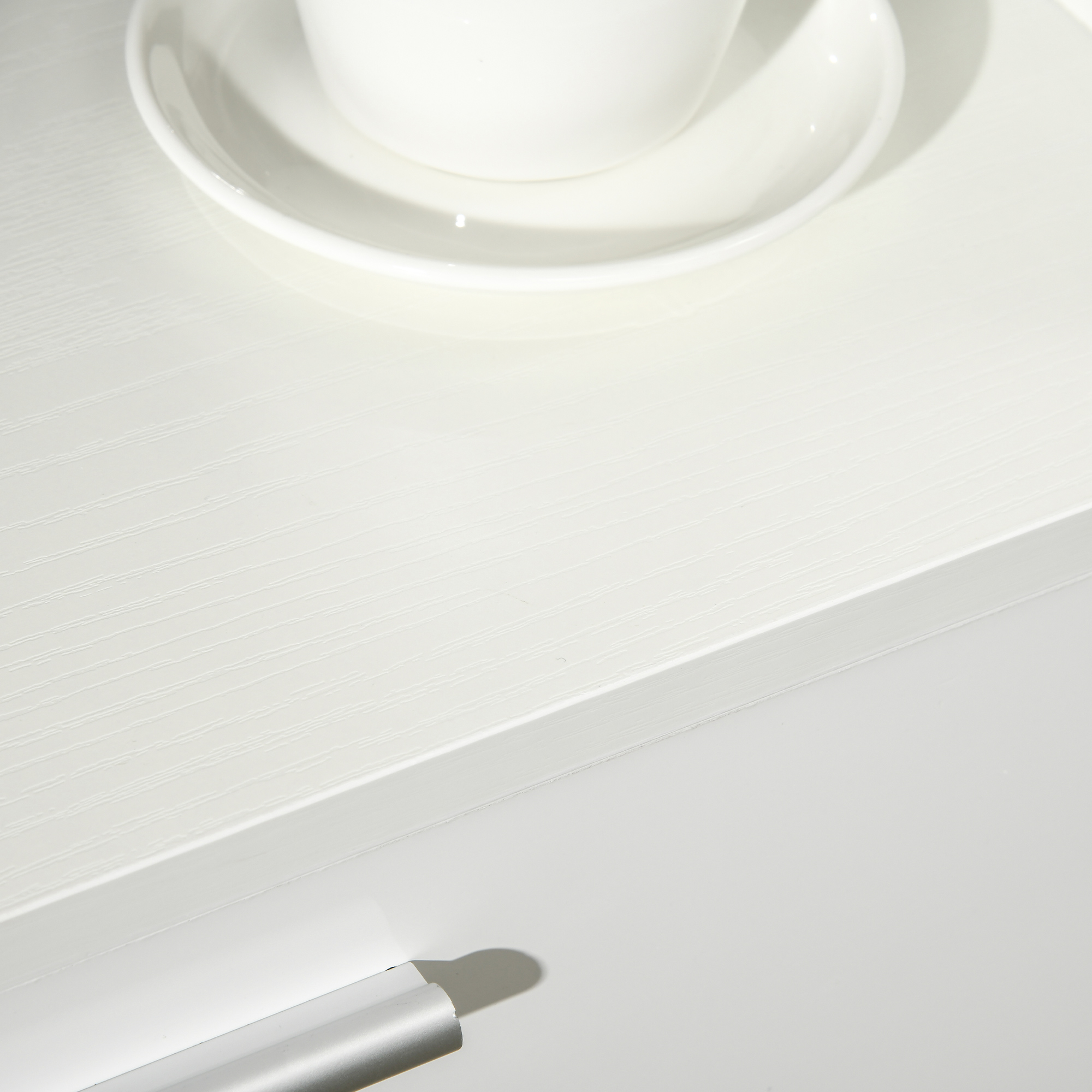 Specification: - Colour: High Gloss White Front Panel, White Wood Grain Side Panel