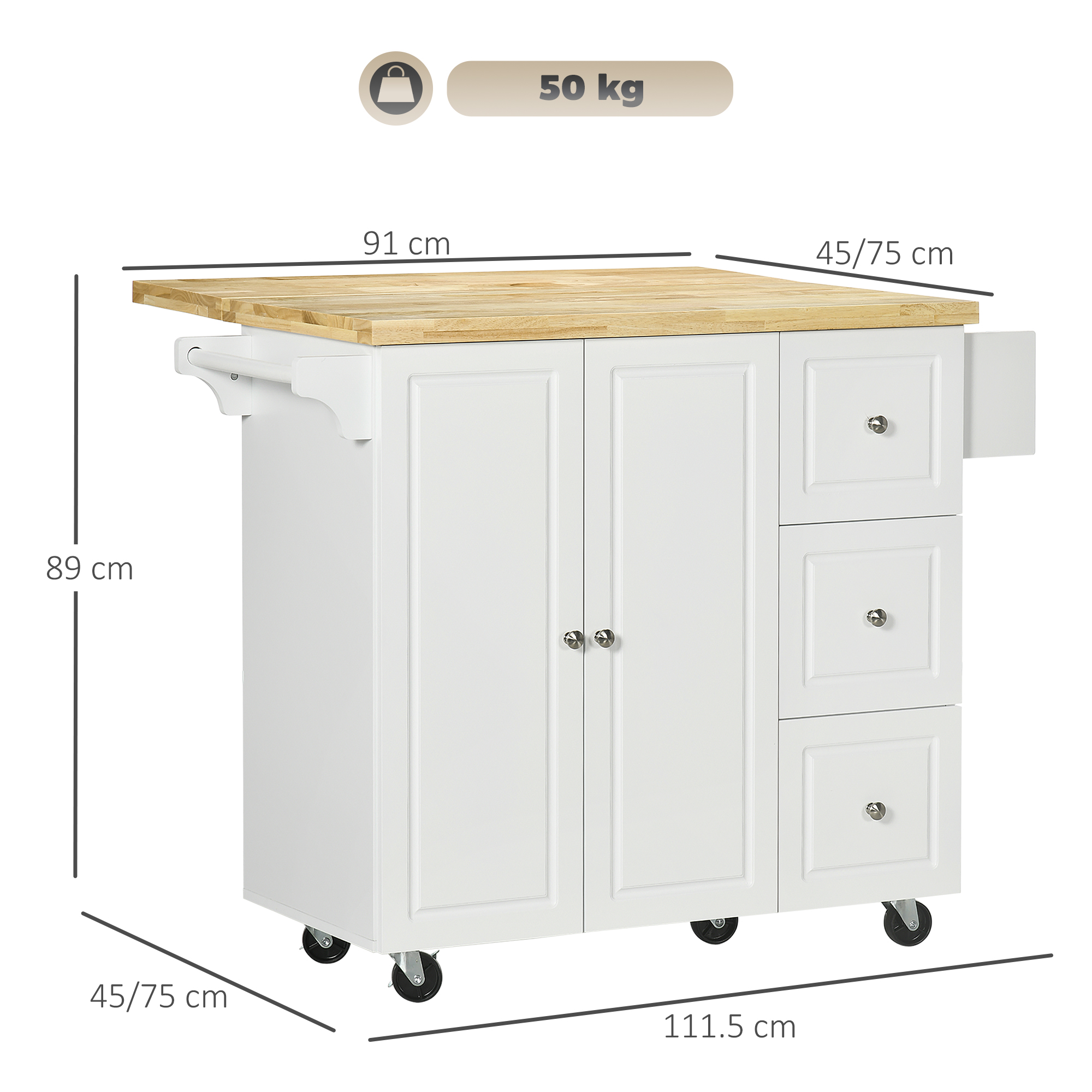 Organize your kitchenware, dinnerware, and other utensils with this kitchen island cart. Including a large cabinet, three drawers, this kitchen island offers you lots of storage space and helps you keep everything organized. Four wheels make the movement easier. This kitchen island comes with a drop-leaf which offers your extra space, suitable for dining and drinking. Take the hassle out of running around when this HOMCOM kitchen island cart has everything you need in place.
