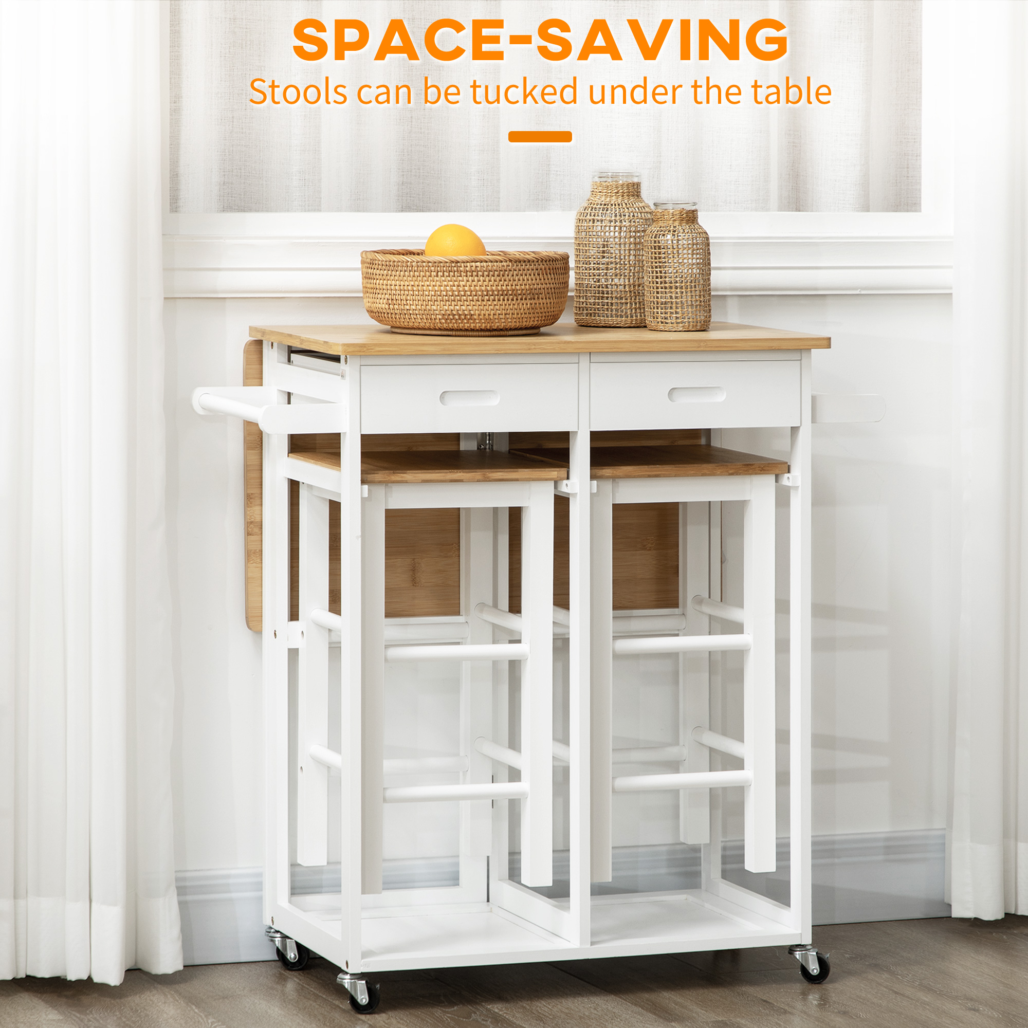 A 2-in-1 set to relax and dine with company - say hello to this HOMCOM breakfast bar set. It comes with a drop-leaf table and two stools - room for you and company. Lift up the table top to extend the dining space; use the two drawers to store smaller items close to you for convenience. The two stools slide into the table - a compact set which tucks neatly into corners when not needed. Complete with lockable wheels to move it around and set into a place of your choice.
