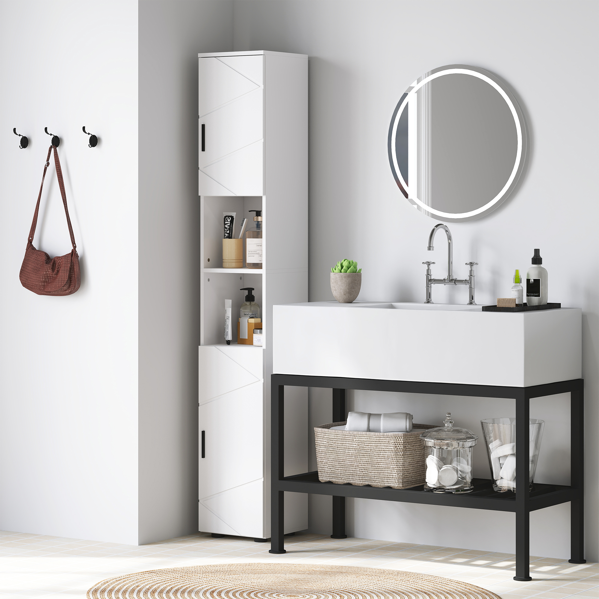 - Two open shelves and two 2-tier cupboards neatly arrange your towels, linen and other bathroom essentials
