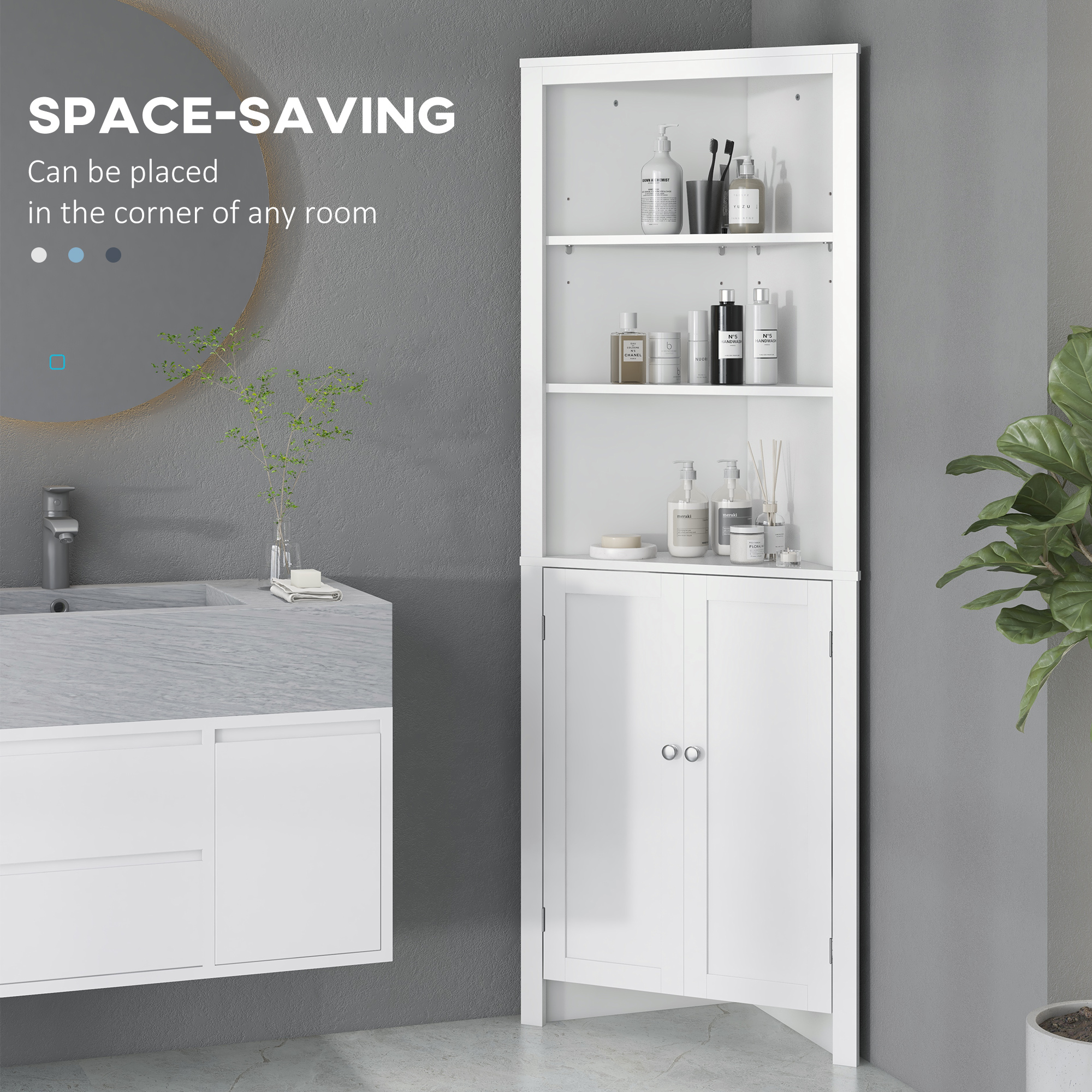 A simple bathroom unit made ready for your home space. This kleankin bathroom furniture comes in a corner design, with a sleek and smooth finish. There are 3-tier open shelves and a cupboard for separate storage areas. Two adjustable shelves can be moved to three different positions, making it easier to fit different-sized items. The elevated base helps prevent moisture from damaging the bottom. Bring this space-saving small cupboard home to organize your space!
