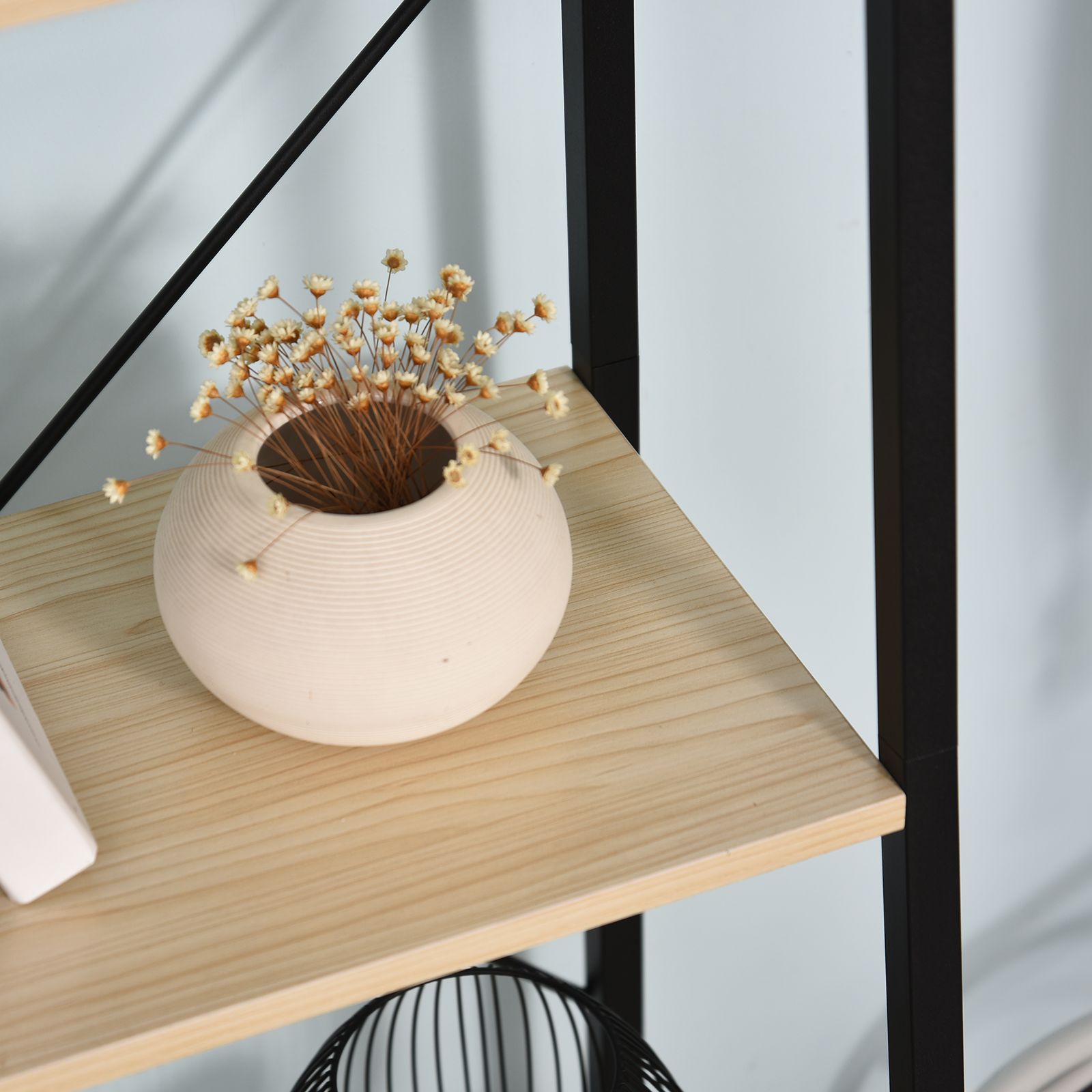 - Colours : Black (frame) and natural wood color (shelves)