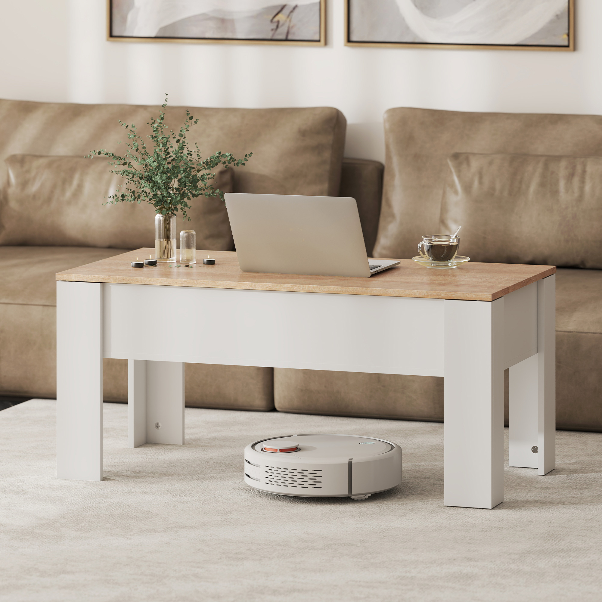 Add a chic, modern style and function to your living room or office with this HOMCOM lift up coffee table. The extending table top lifts up and out to create a convenient floating desk, revealing a hidden storage compartment below. Built from particle board, this living room table is built to withstand long term use. Stylish and functional, this pop up coffee table is perfect in front of a couch or in a home office, helping to provide multiple work surfaces and storage options.