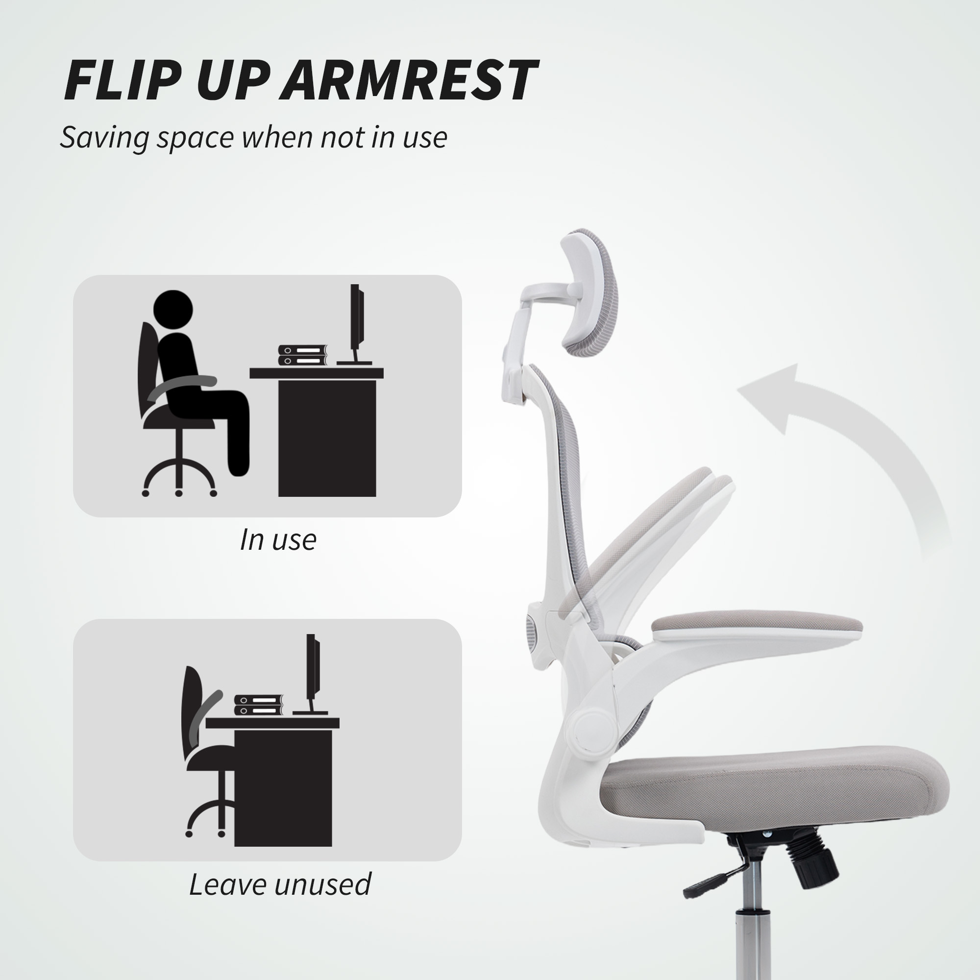 All day support as you work, with this HOMCOM office chair. A padded seat for comfort, with mesh fabric all over: this helps keep the chair and you as cool as possible. Set the seat between 43–51 cm to work at the level you want, with an adjustable headrest for head and neck support. It has lumbar support for your lower back. When done, all you have to do flip the armrests up so it fits underneath your desk.
