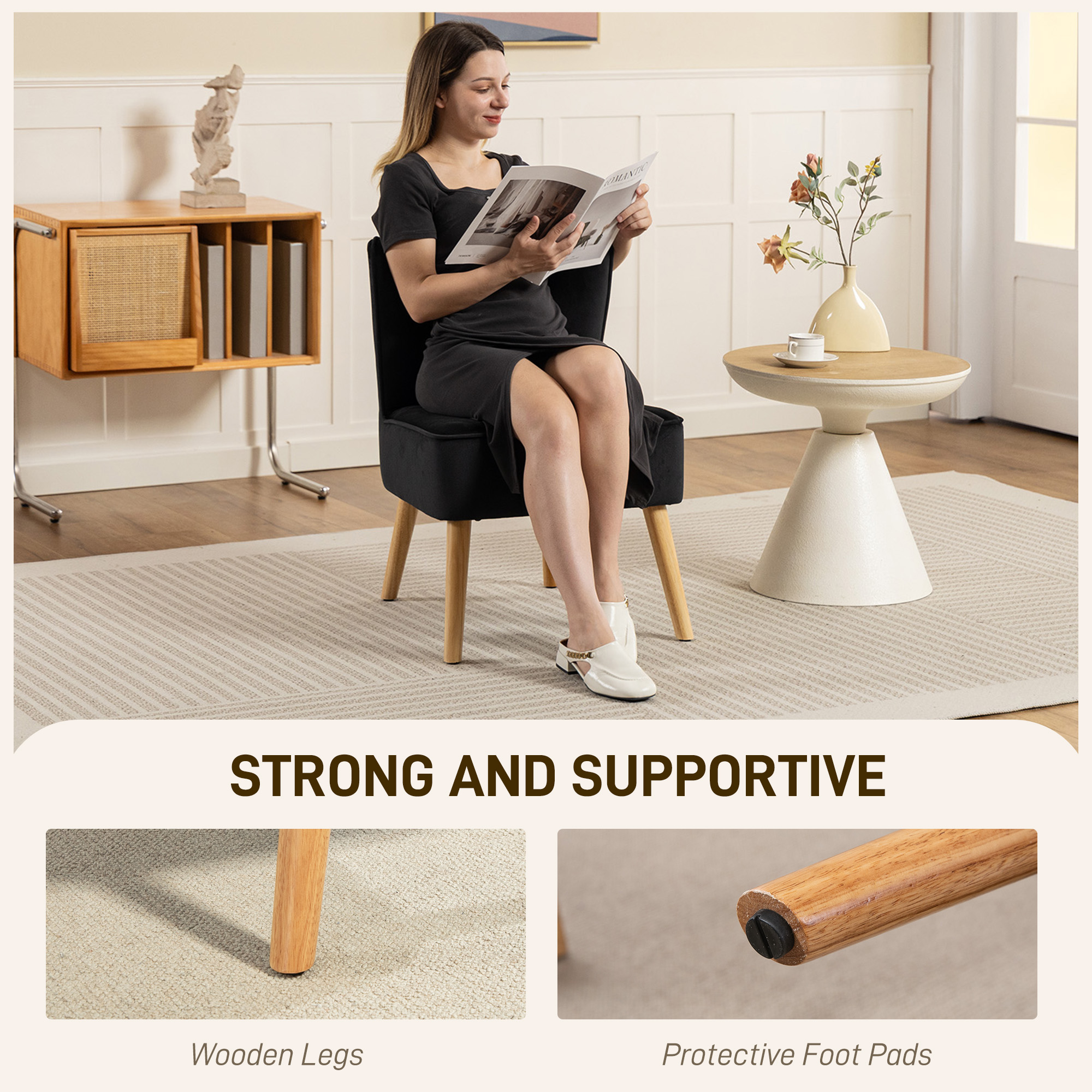 - Velvet-feel upholstery is soft and beautiful