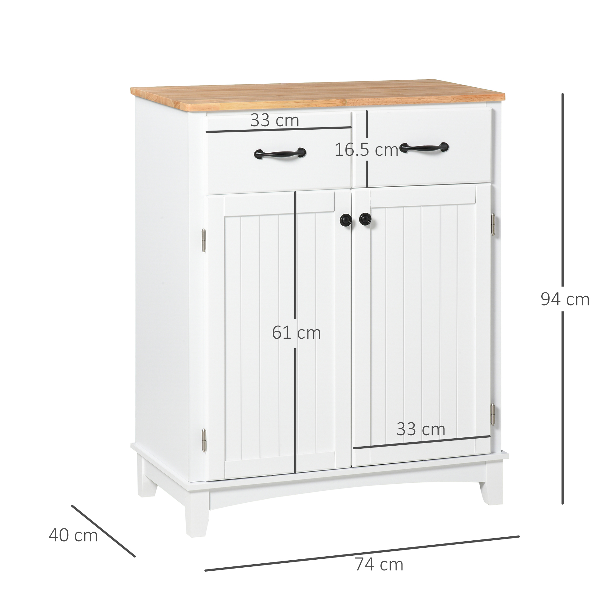 Refresh your home and add more storage space by this modern style sideboard from HOMCOM. With two easy-slide drawers and a spacious cabinet, there's lots of room to store your utensils, cookware, kitchenware and more. MDF structure is durable, with a wooden countertop for a solid holding - and even preparation - space. Finished with black metal handles on the doors and drawers.