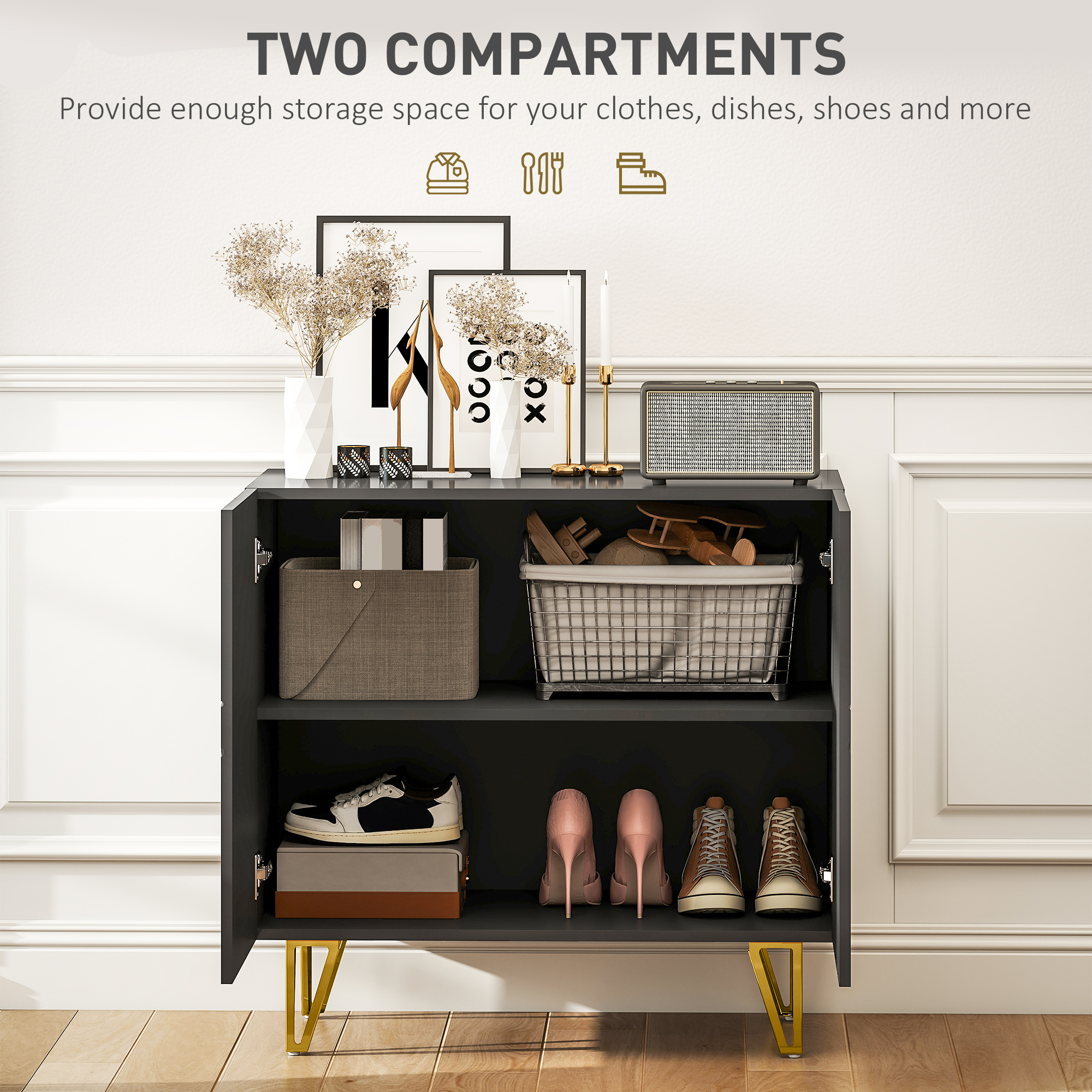 Keep your home stylish and tidy, with a touch of elegance - look to this HOMCOM sideboard. A high gloss finish, covered with line indents and with gold coloured legs makes this is beautiful piece which effortlessly infuses elegance into your space. Inside, there are two large storage areas, offering plenty of storage; adjust the shelf to fit in differently-sized items easily. The living room cabinet comes with anti-tipping straps to fix securely to a wall.
