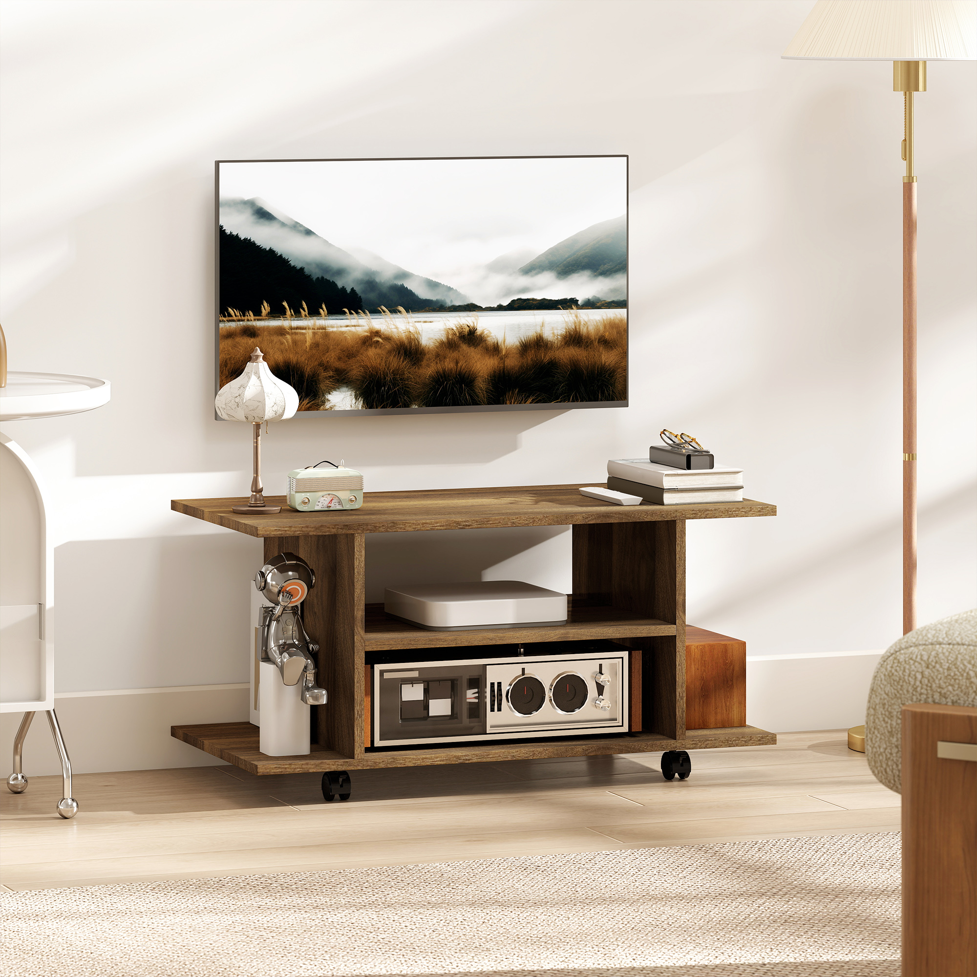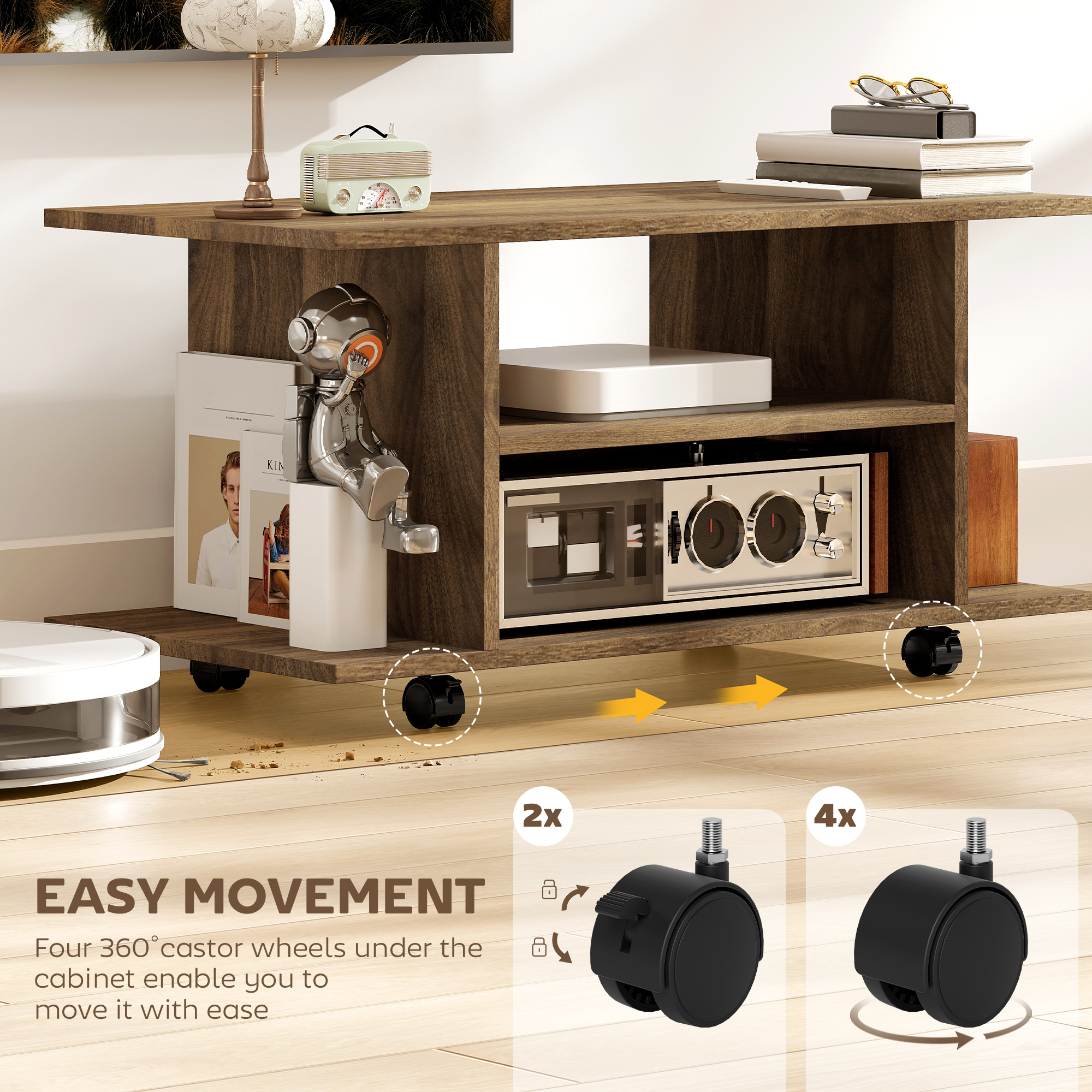 This stylish TV unit is a suitable option for living room furniture. Featuring a stand top and a two-layer open shelf, it provides more space for your other stuff. Four 360° castor wheels under the entertainment unit enable you to move it with ease to wherever you'd like. They also complete with brakes, so the table can be kept static in a certain place.