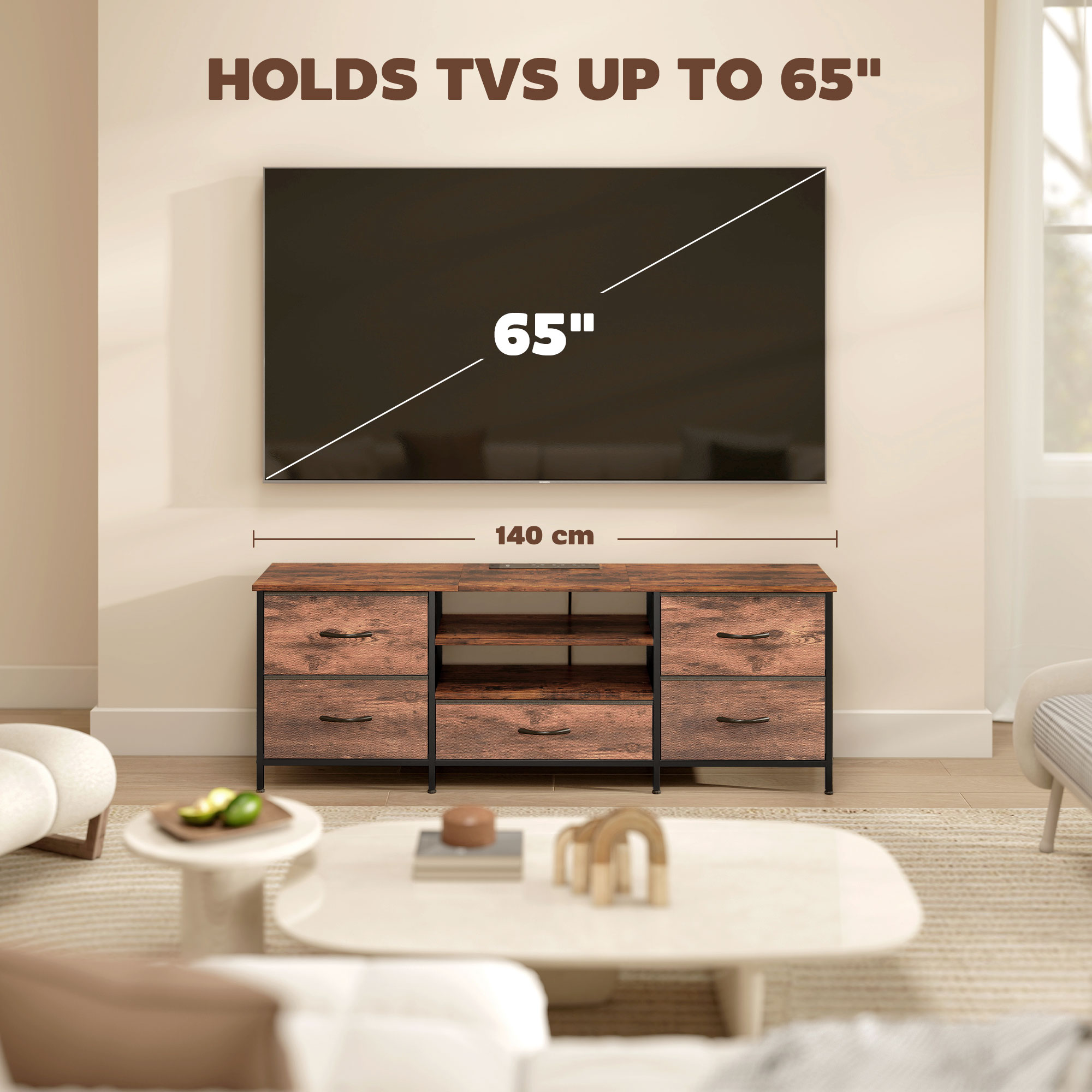 Our HOMCOM TV cabinet brings style and order into the everyday. It comes in an industrial-style design - a dark wood-effect body with dark grey drawers - a bold design to bring a touch of character into your home. With a steel frame, the core is strong and provides full support; fitted with five drawers and with two shelves - there's plenty of storage for media devices and accessories. Complete with adjustable feet for balance.