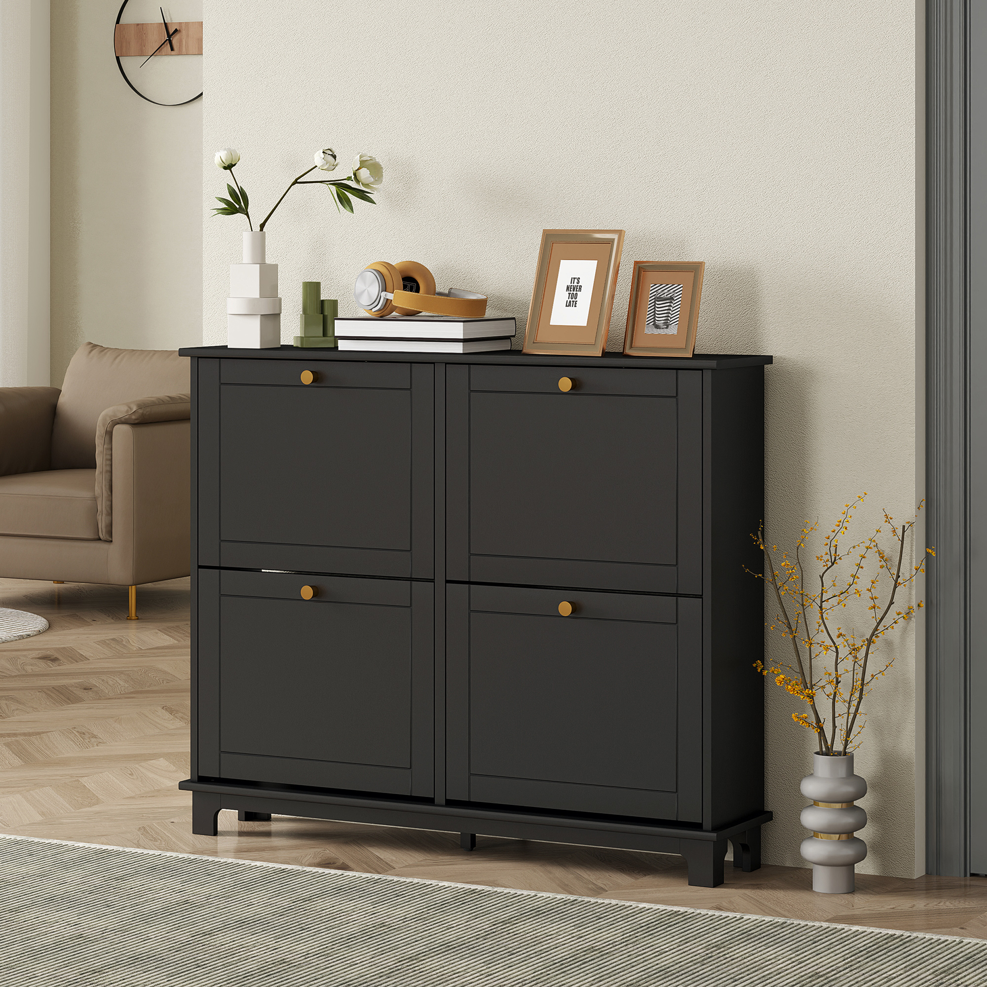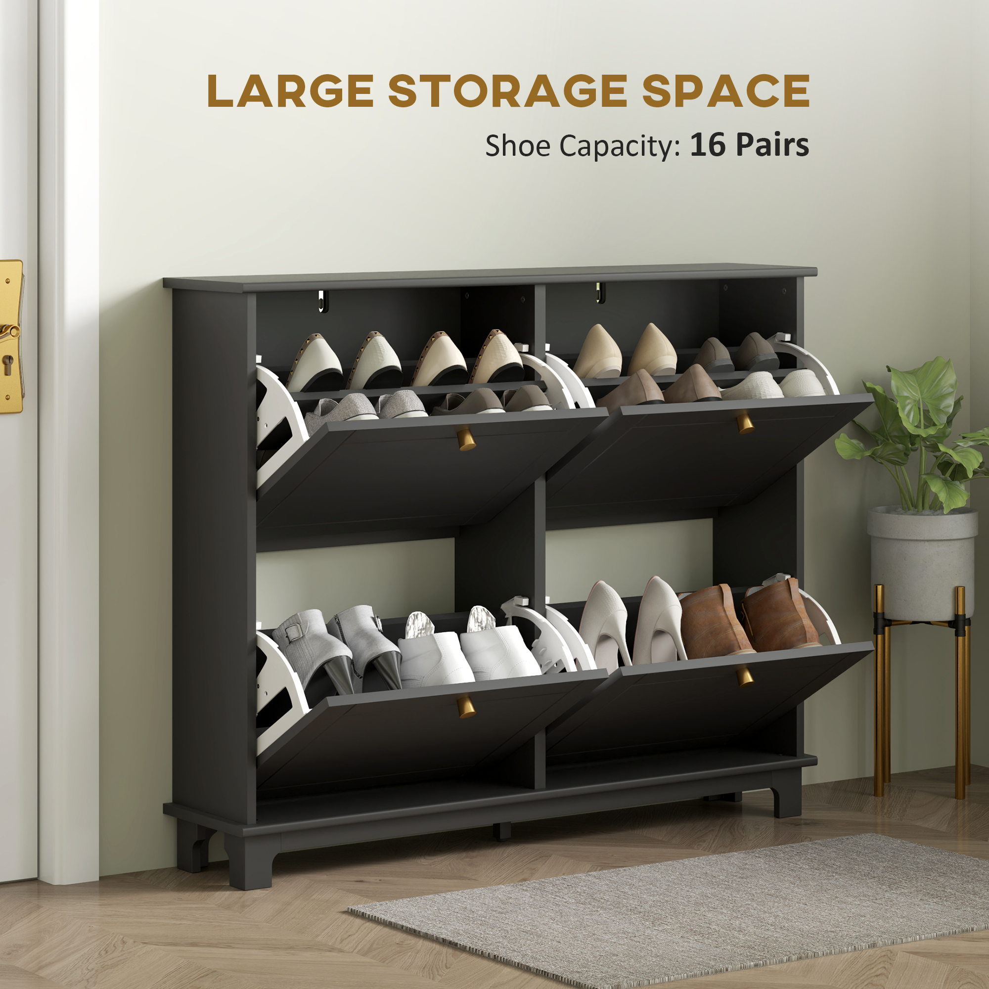 Step into style and organization with the slim shoe storage cabinet from HOMCOM. Its sleek finish, carved lines and chic golden handles add a modern twist to any entryway. This hidden narrow shoe storage features four flip drawers that neatly store up to 16 pairs of shoes, with adjustable shelves for added convenience. Suitable for tight spaces, this hallway cabinet combines elegance with functionality.